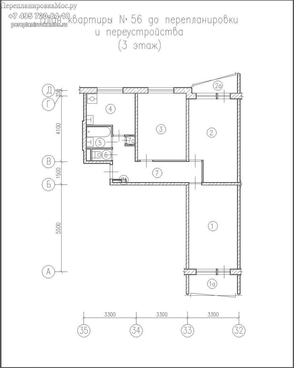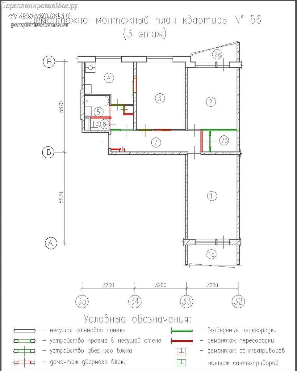 Перепланировка 1605-ам трехкомнатной квартиры