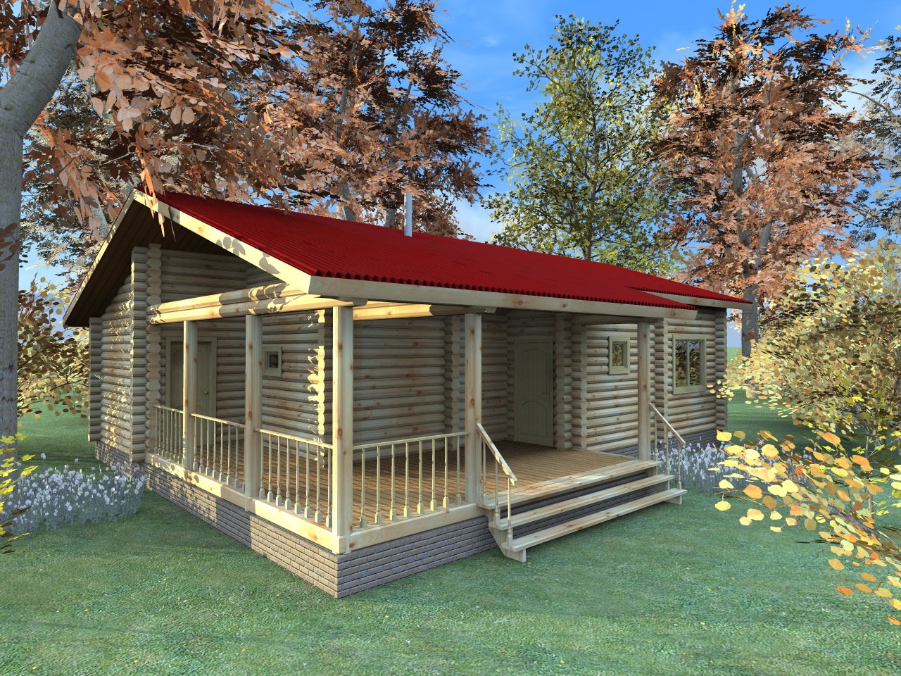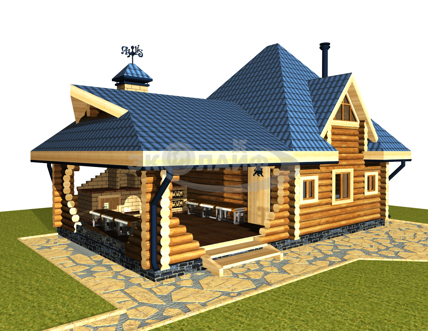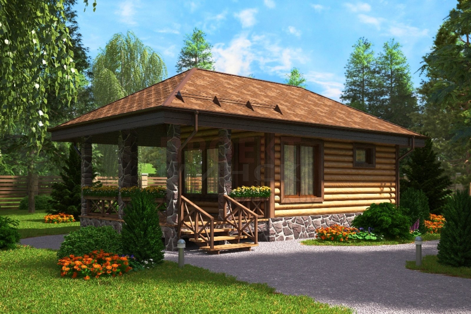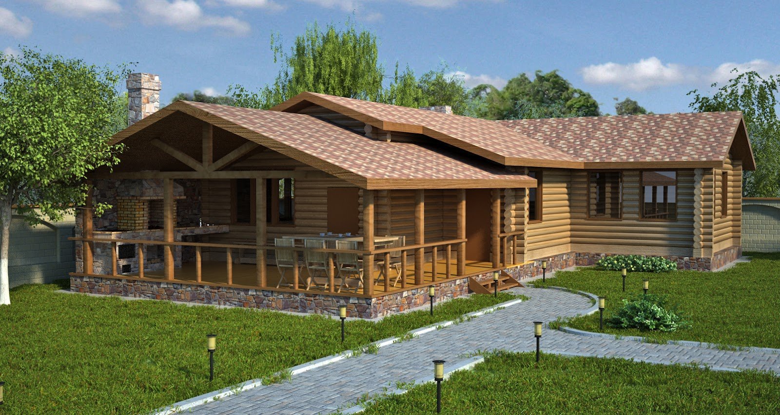 Баня из оцилиндрованного бревна с верандой и барбекю