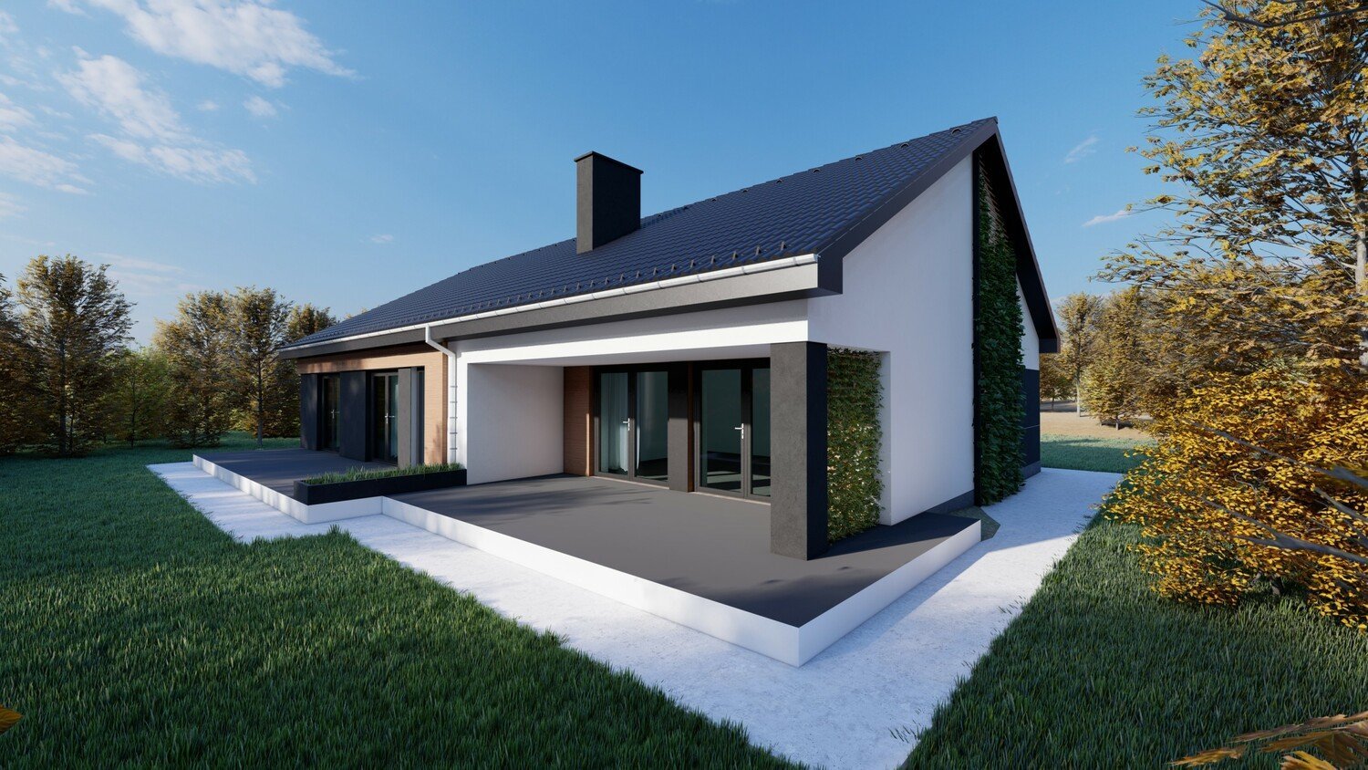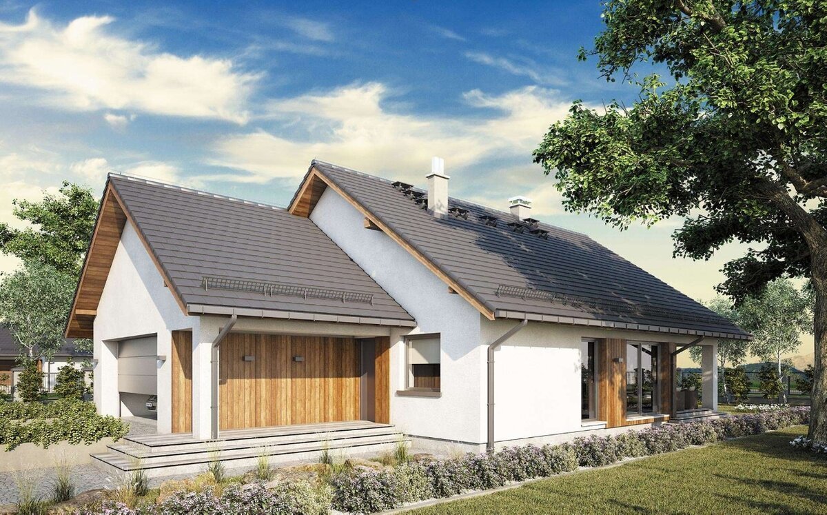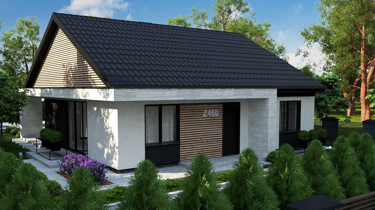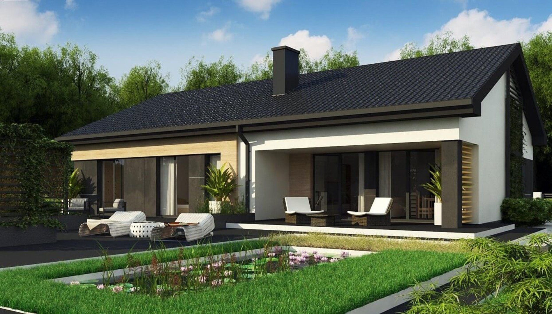 Одноэтажный дом с двухскатной крышей в современном стиле