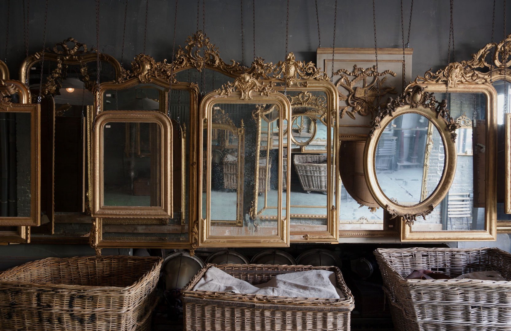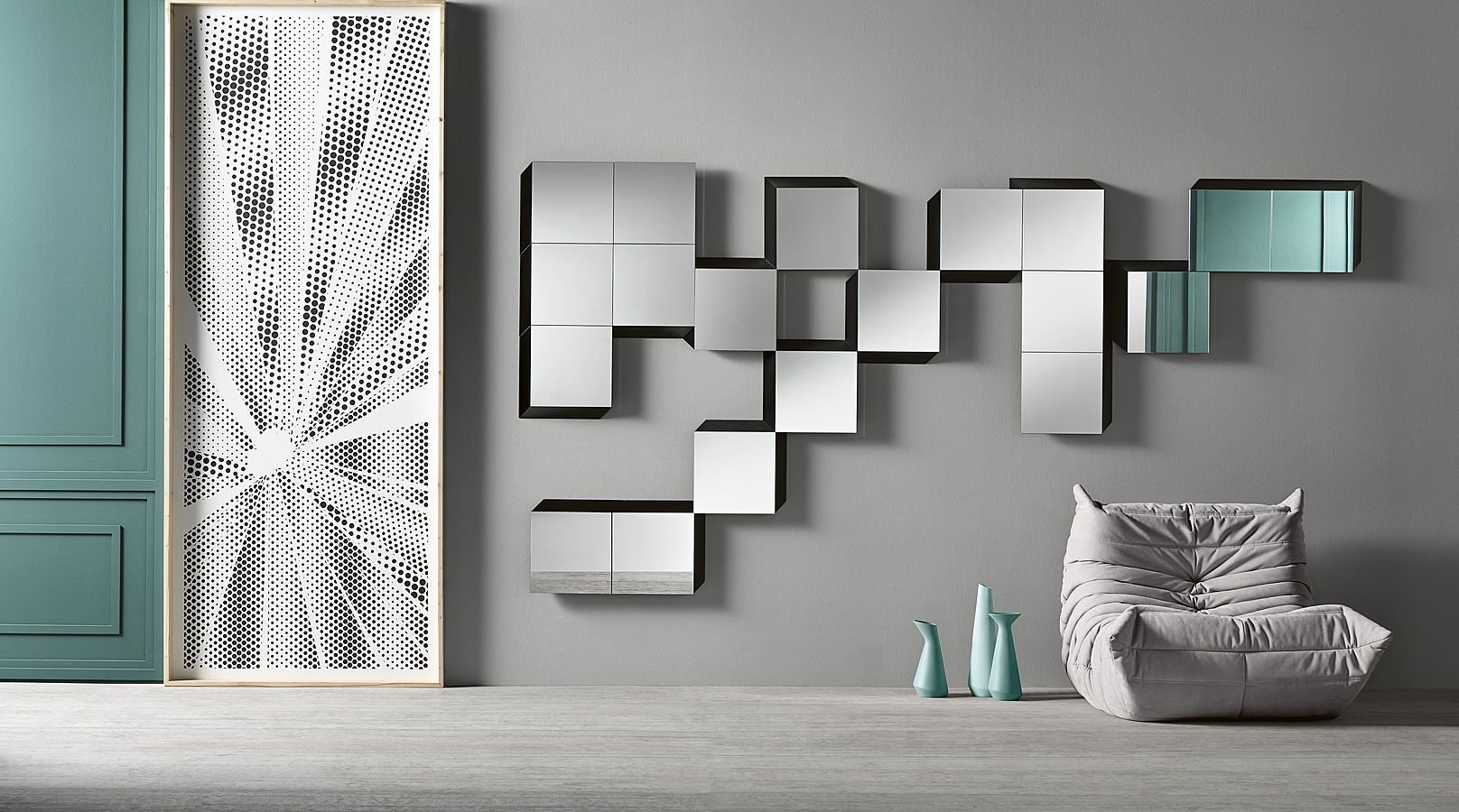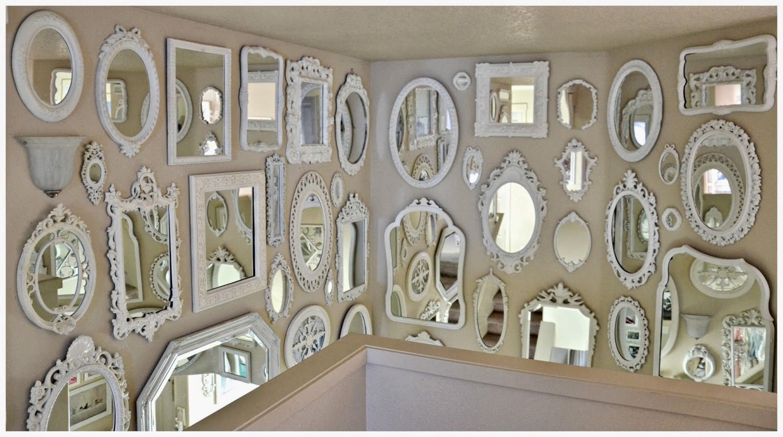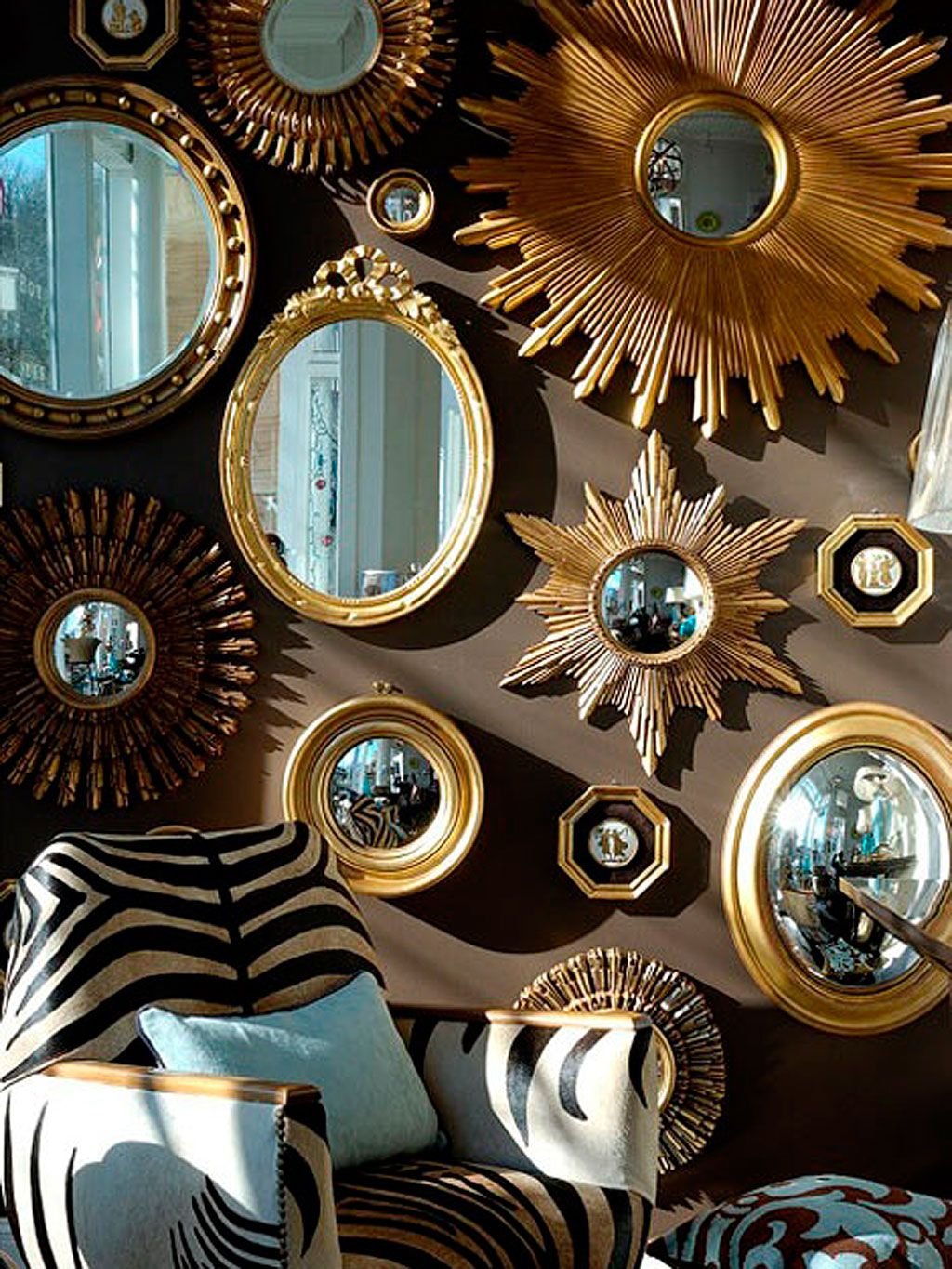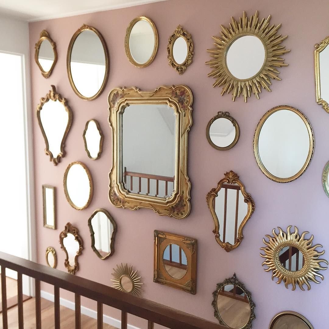 Много зеркал на стене в интерьере