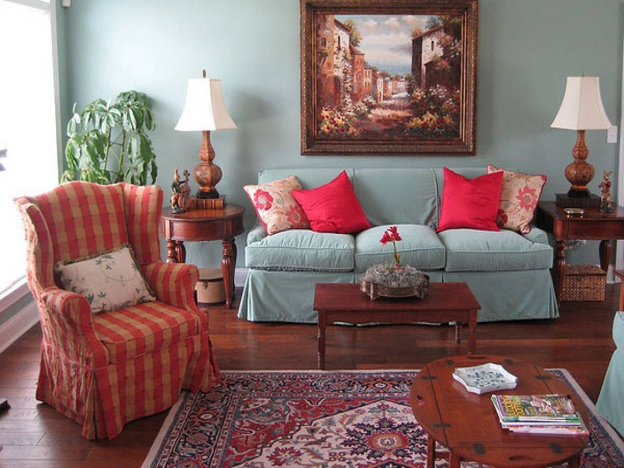 Красный диван в интерьере гостиной