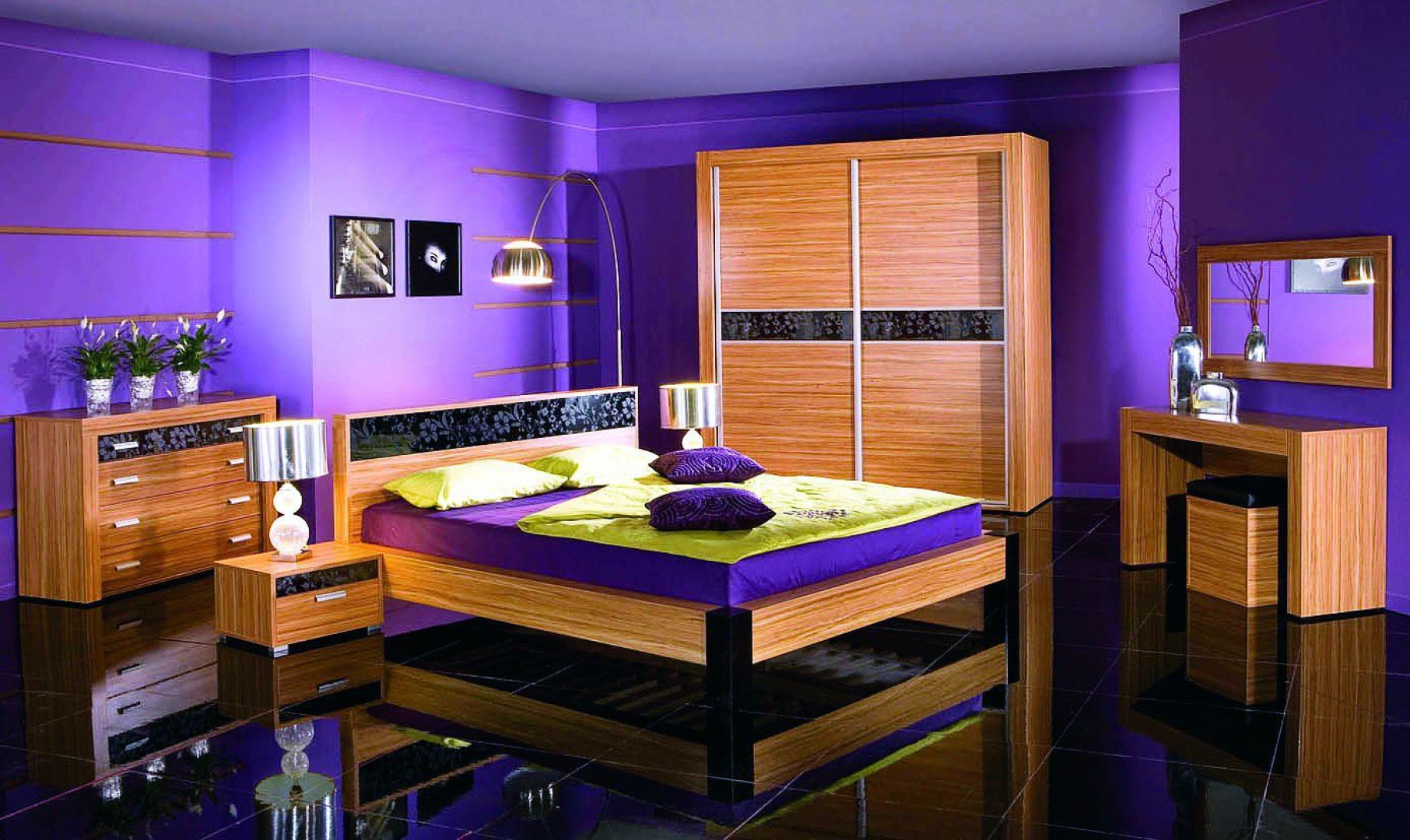 Спальня фиолетовые стены и коричневая мебель