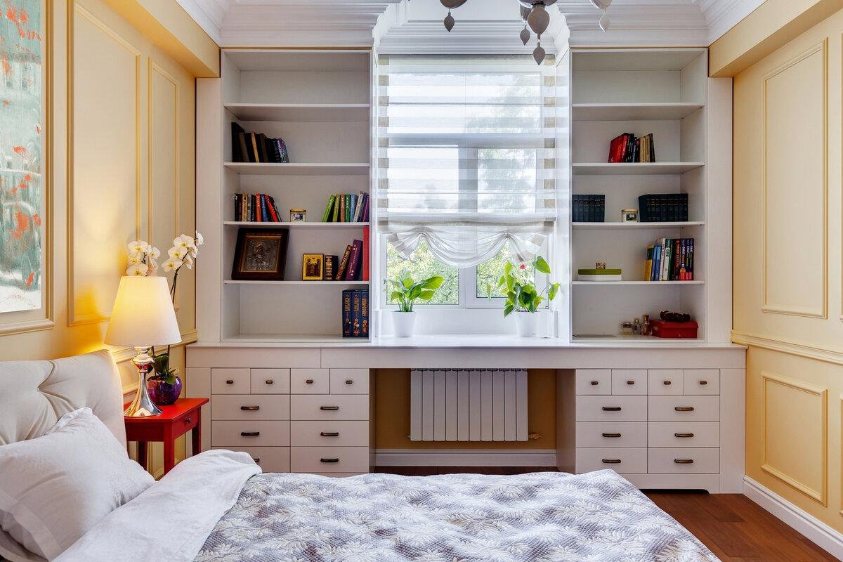 Шкафы вокруг окна в маленькой комнате