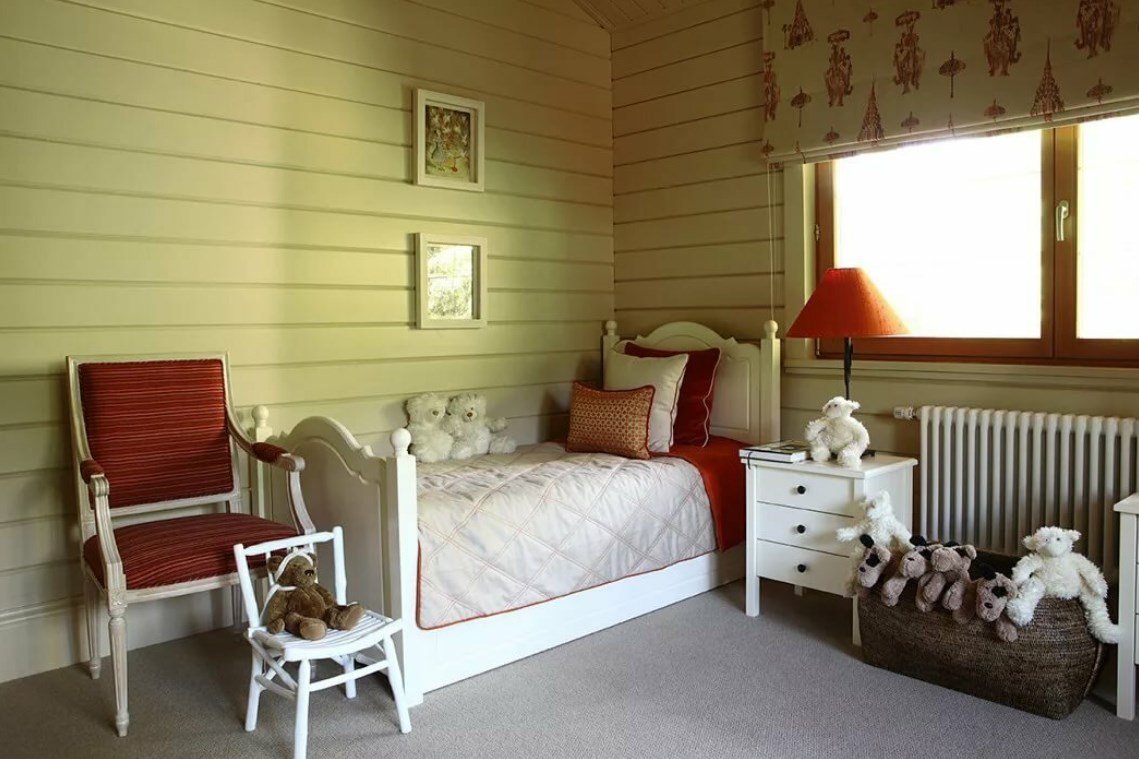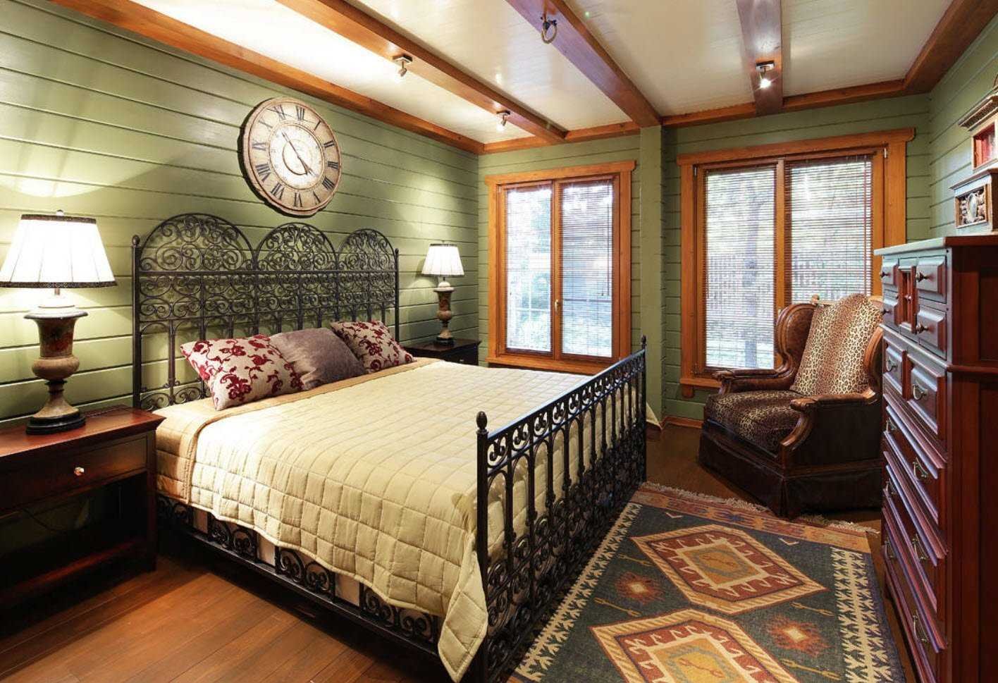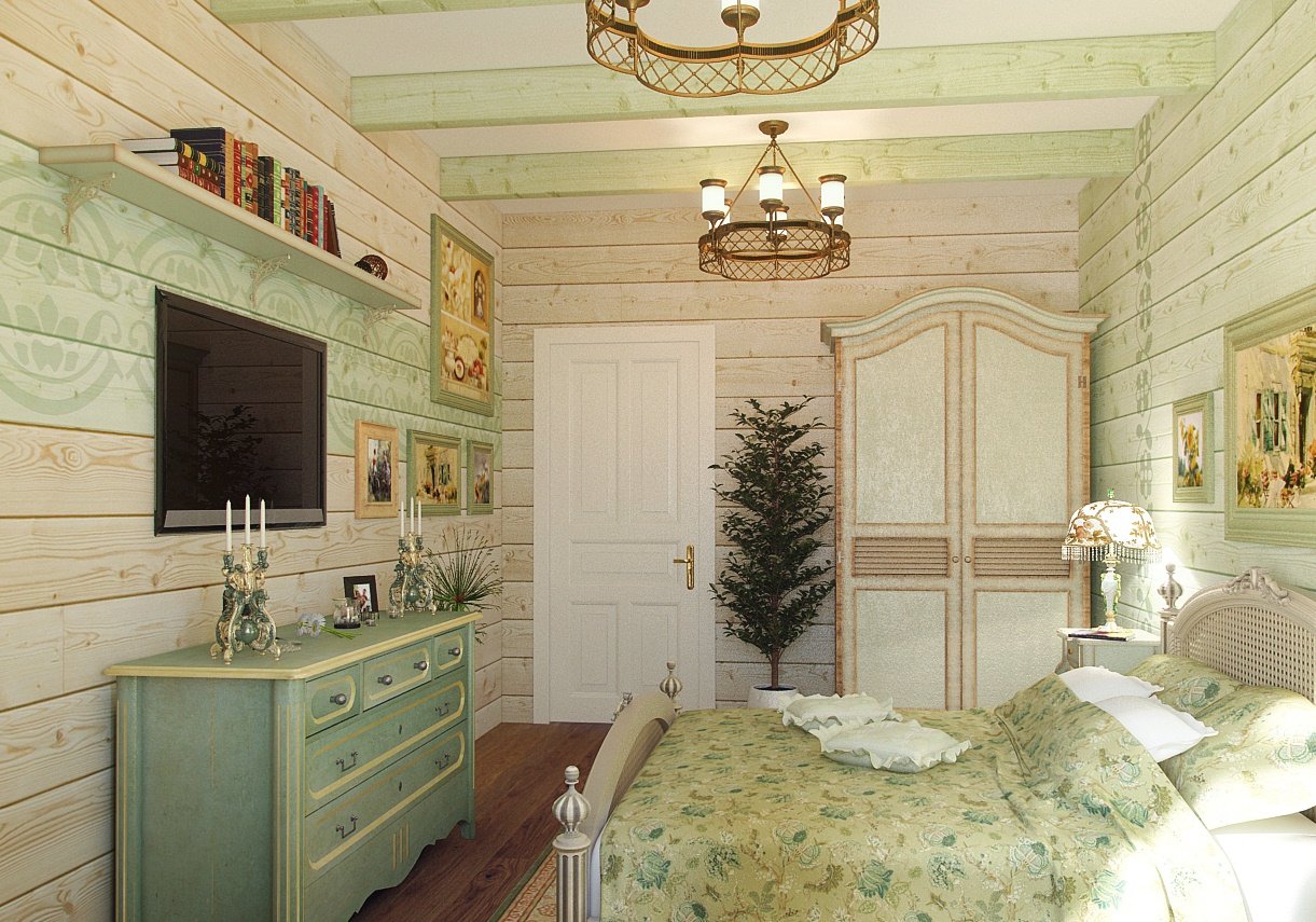 Зеленая спальня в деревянном доме