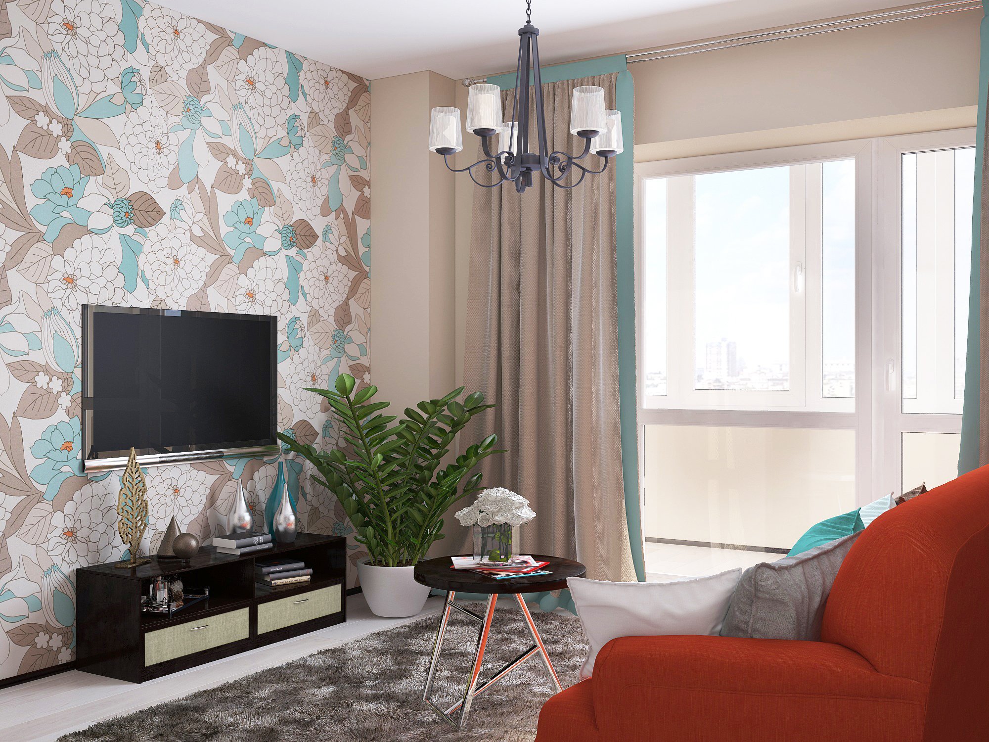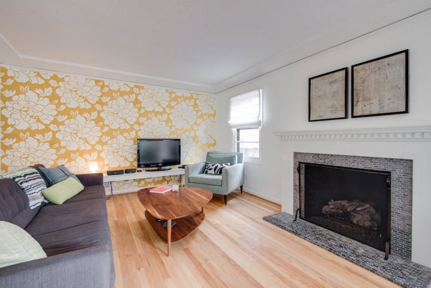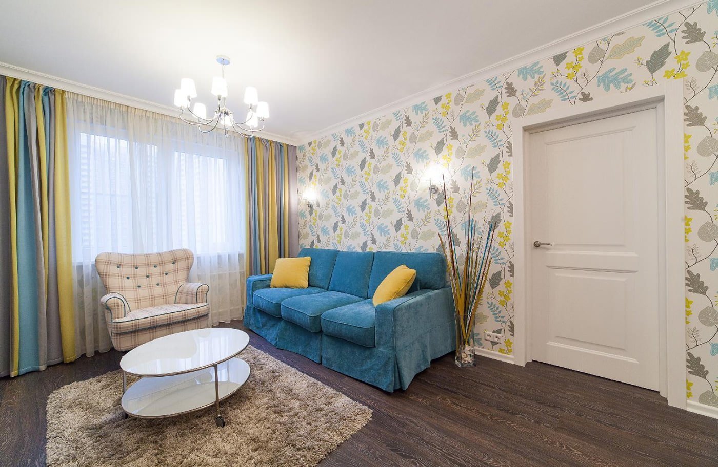 Интерьер прямоугольной гостиной с цветочными обоями