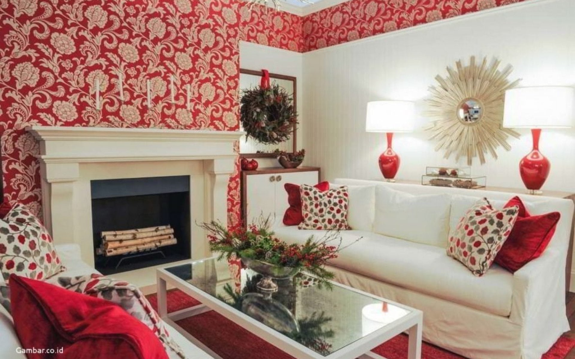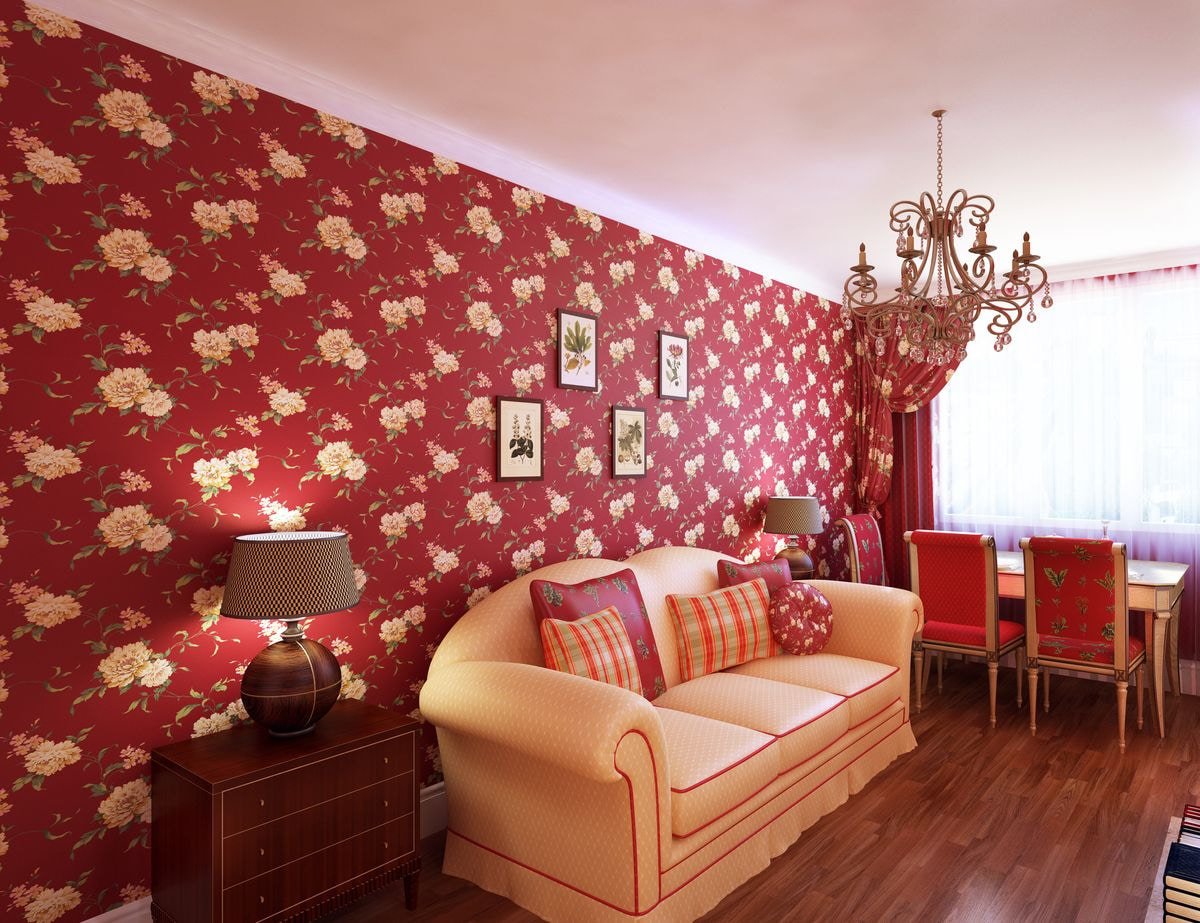 Красные обои в интерьере гостиной