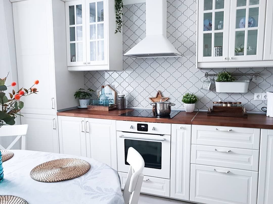 Кухня Будбин икеа белая с деревянной столешницей