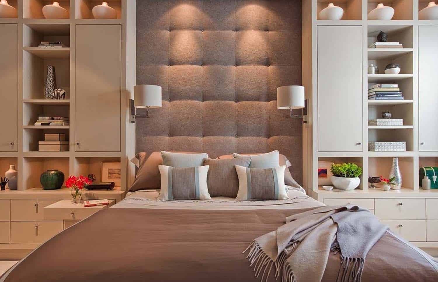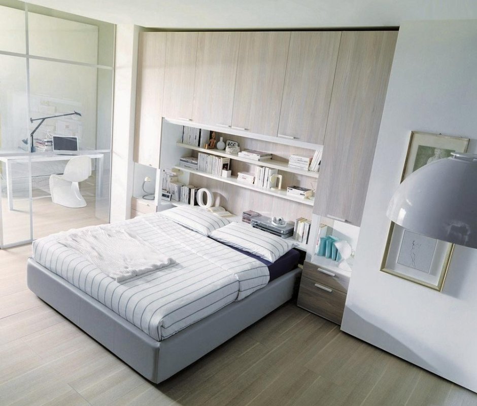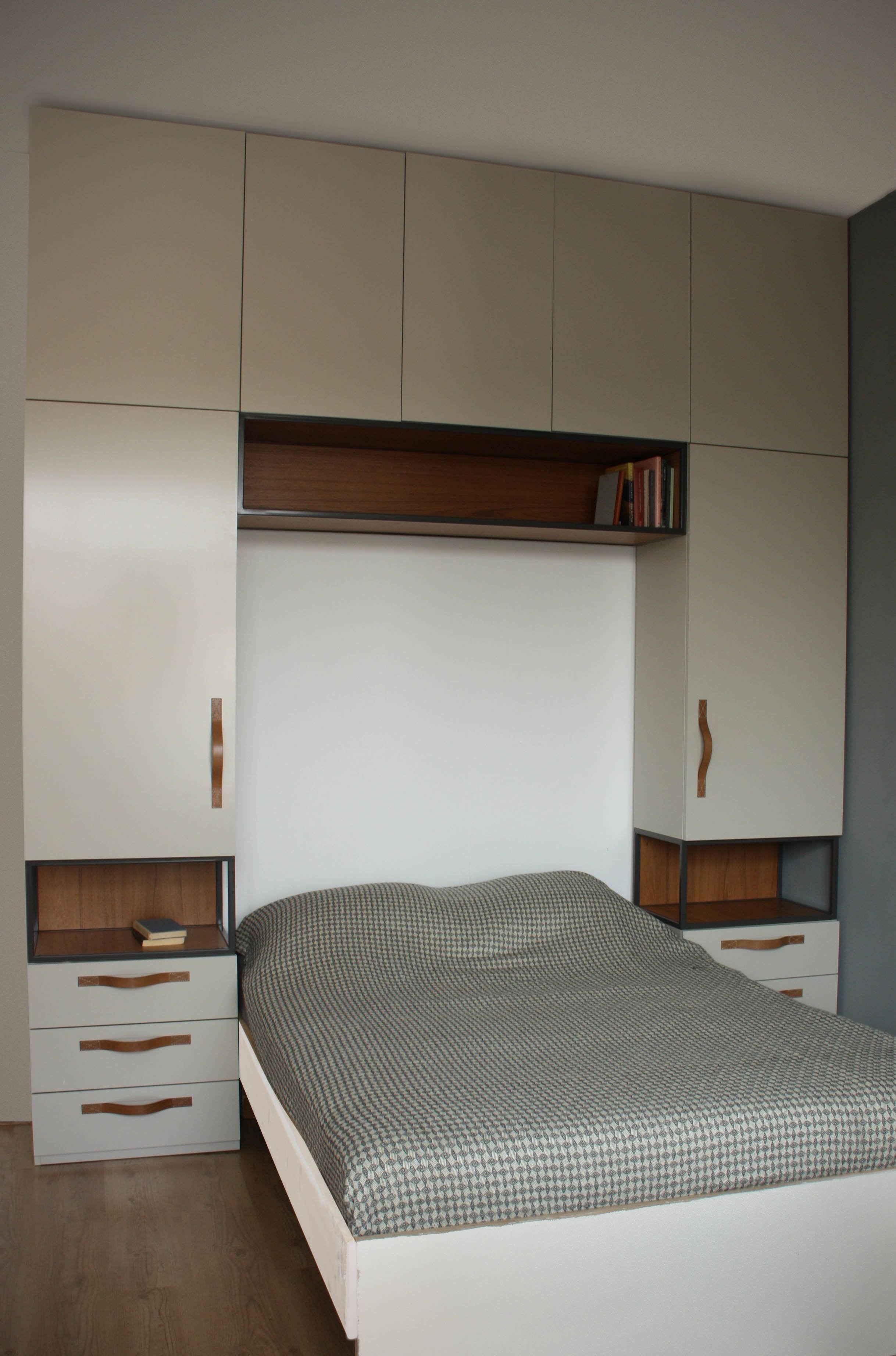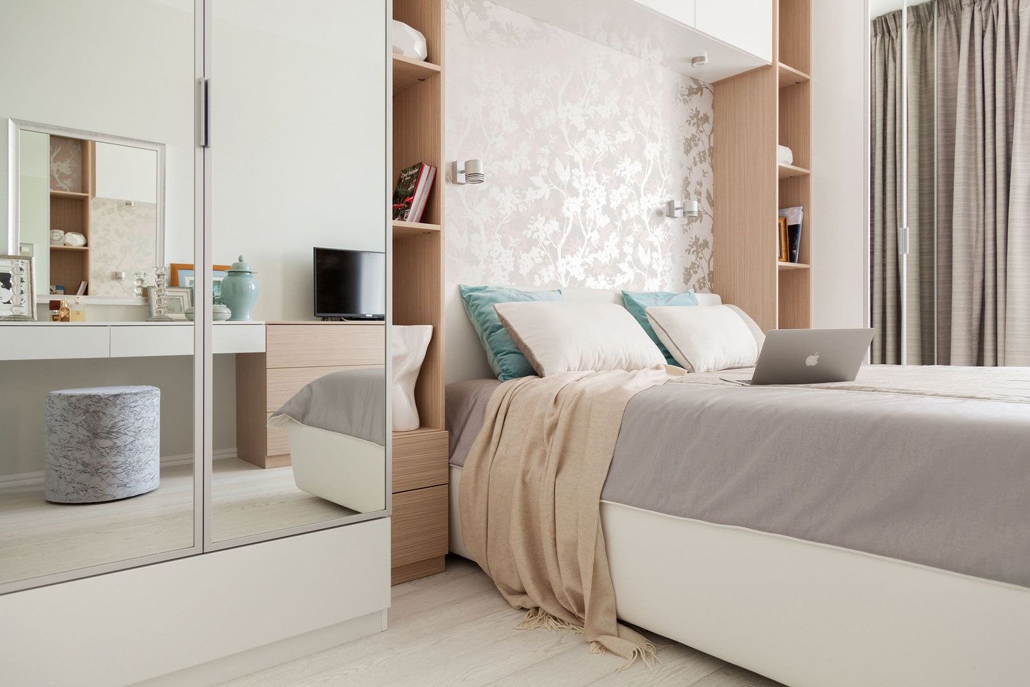 Угловые трапециевидные шкафы с кроватью в спальню дизайн