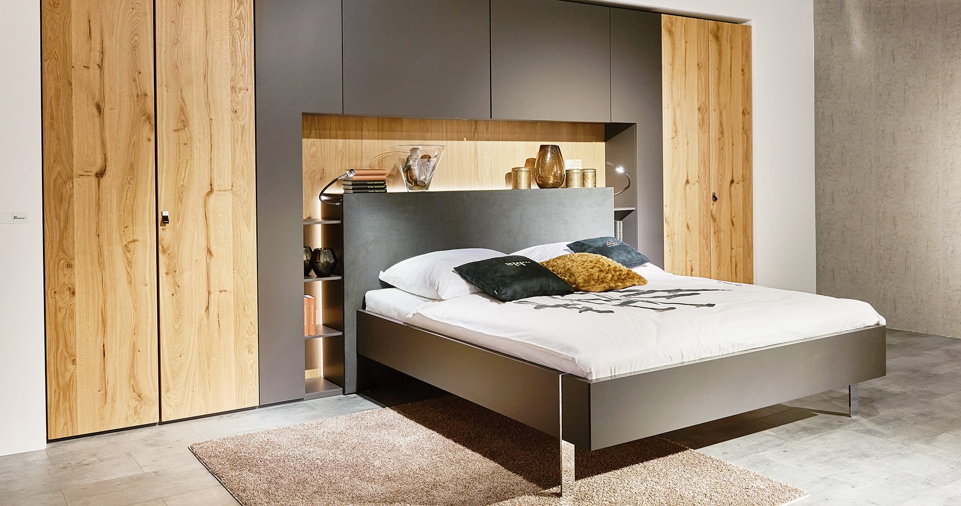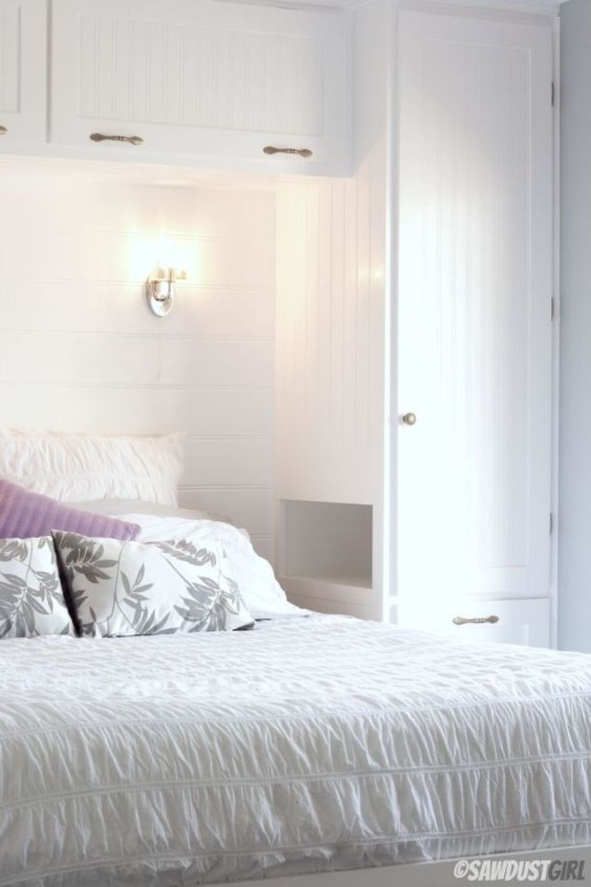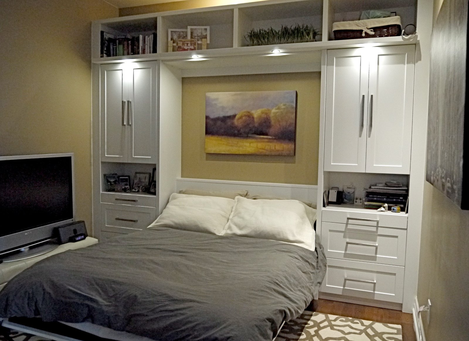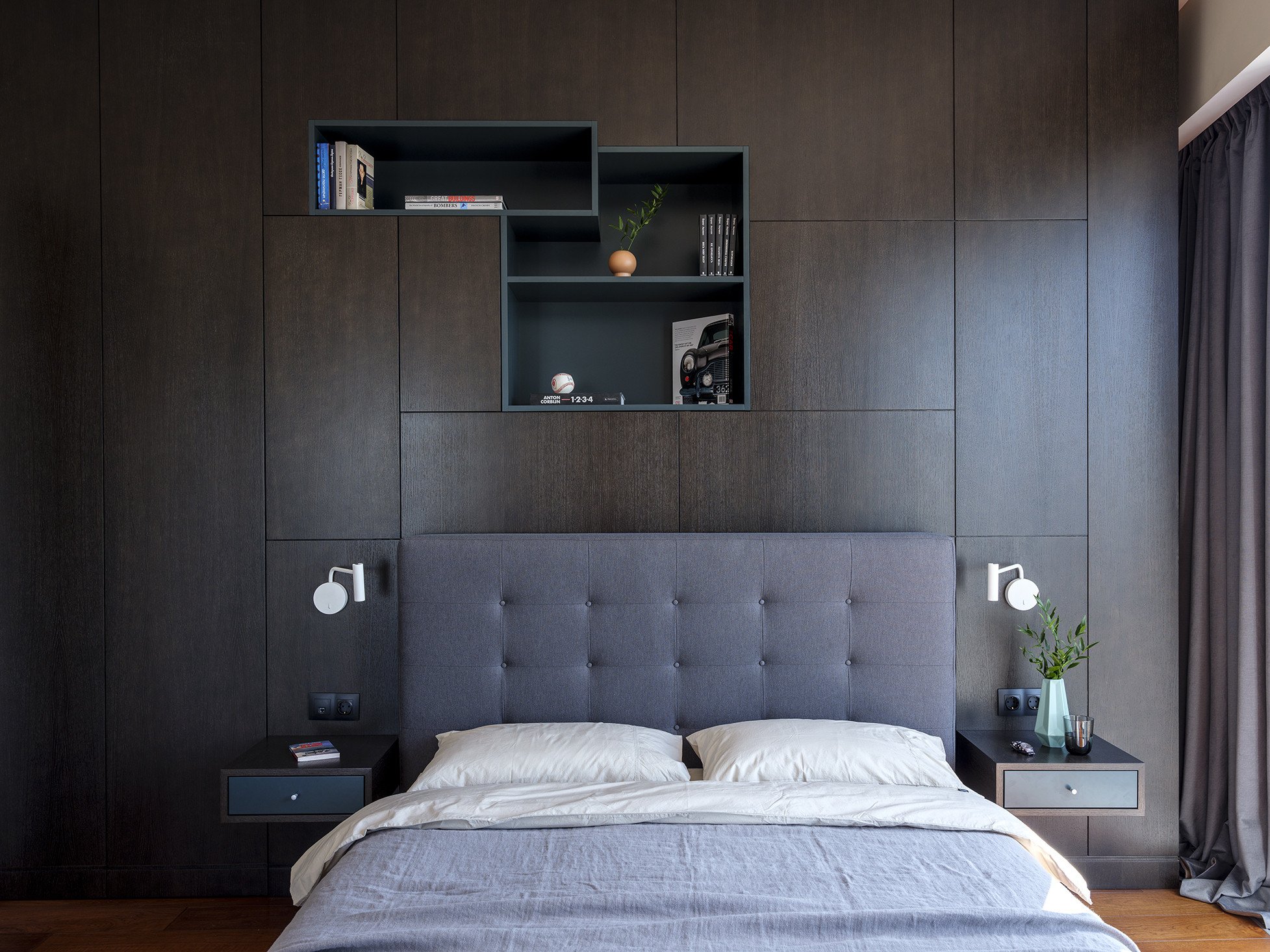 Угловые трапециевидные шкафы с кроватью в спальню дизайн