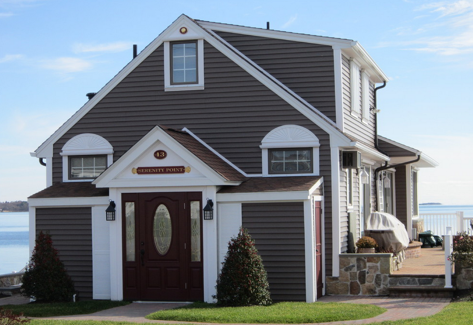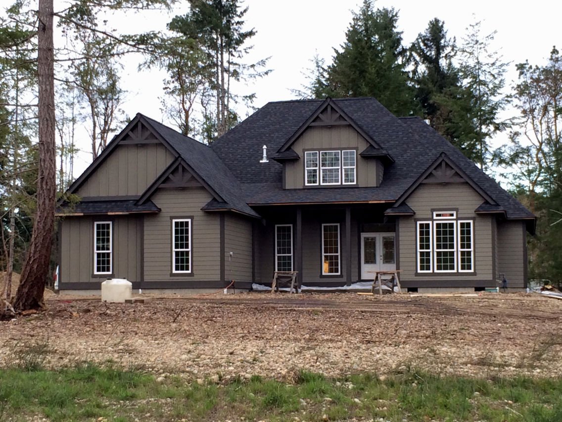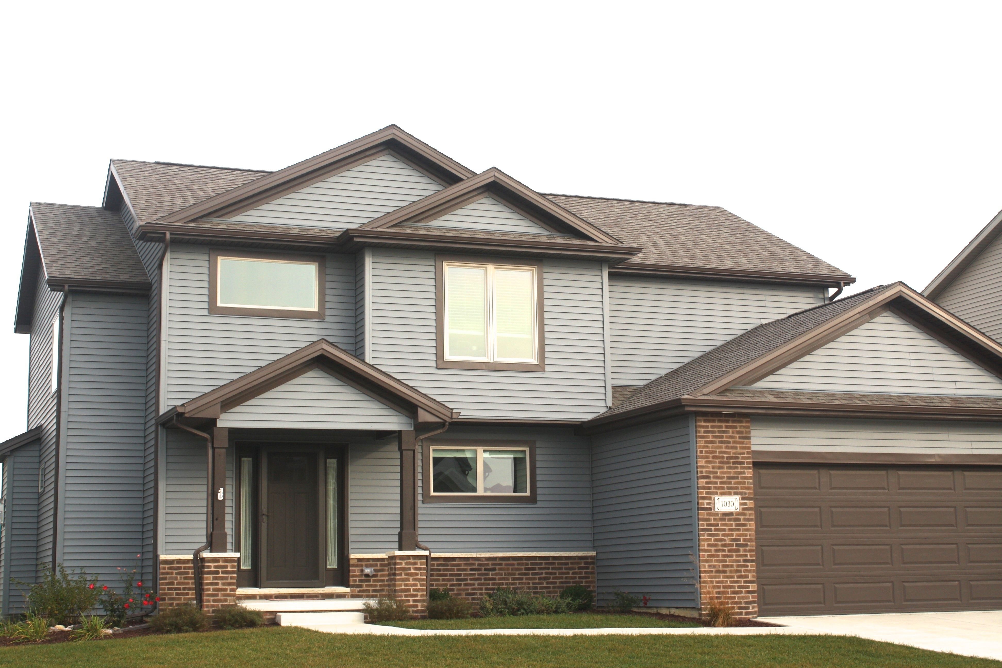 Серый дом с коричневой крышей