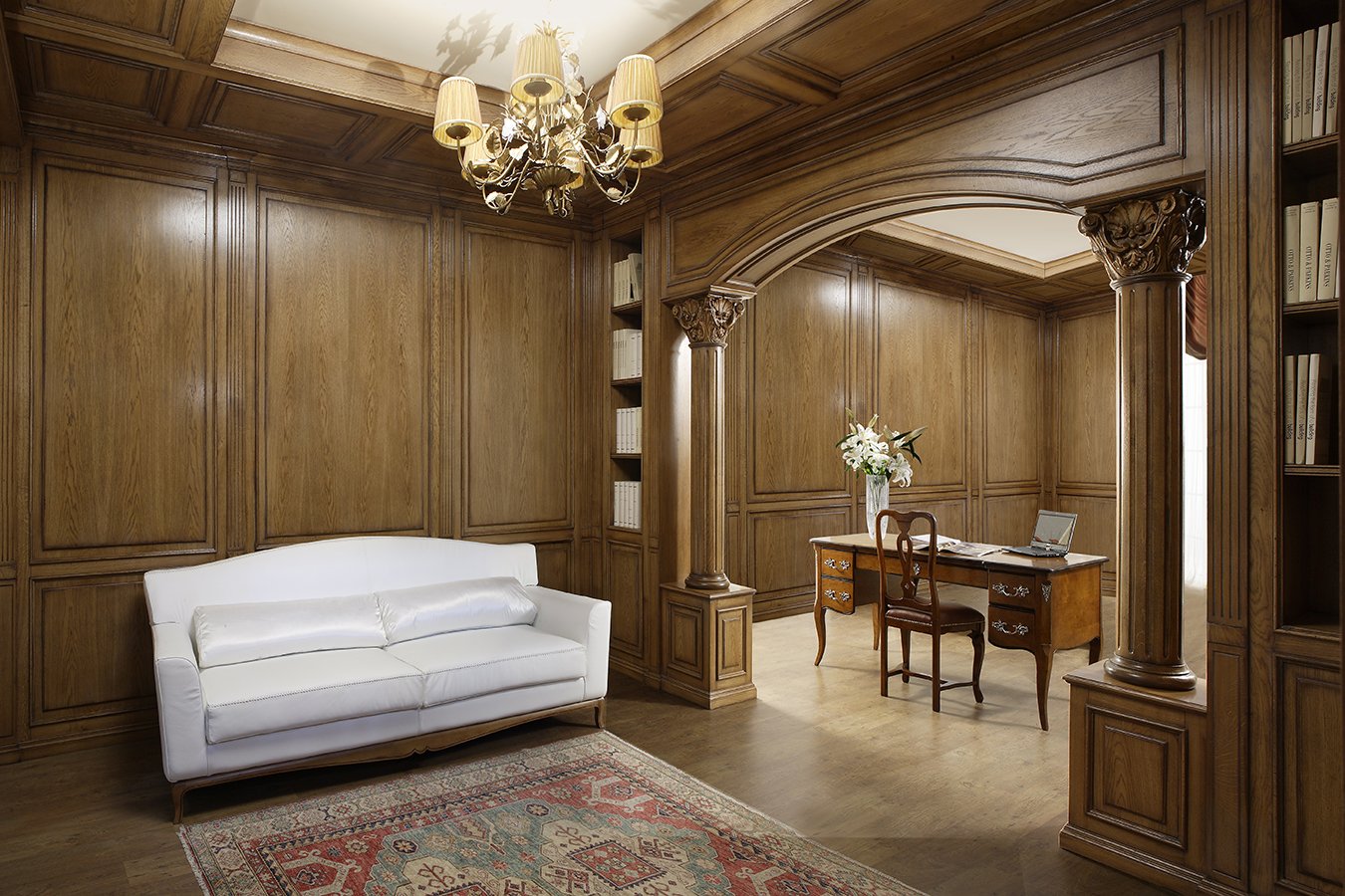 Все стены кабинета украшены резными панелями золоченым