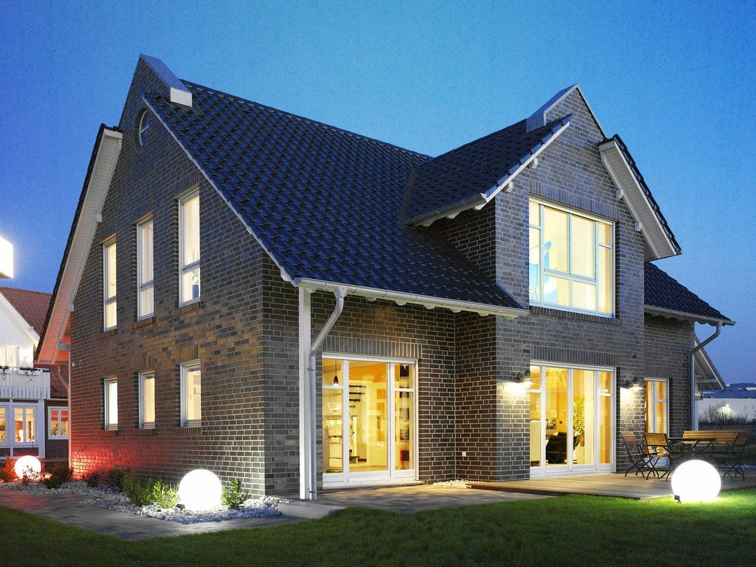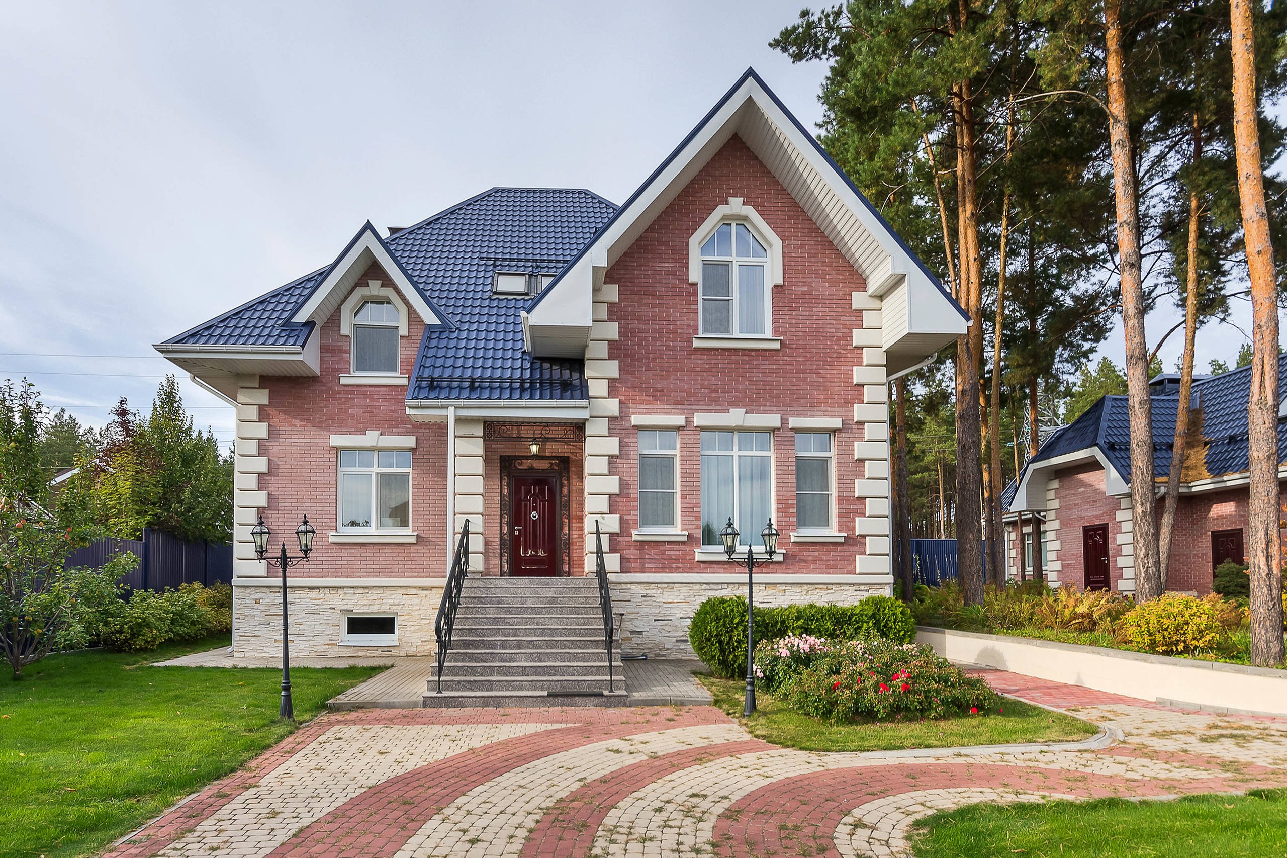 Кирпичный дом с синей крышей