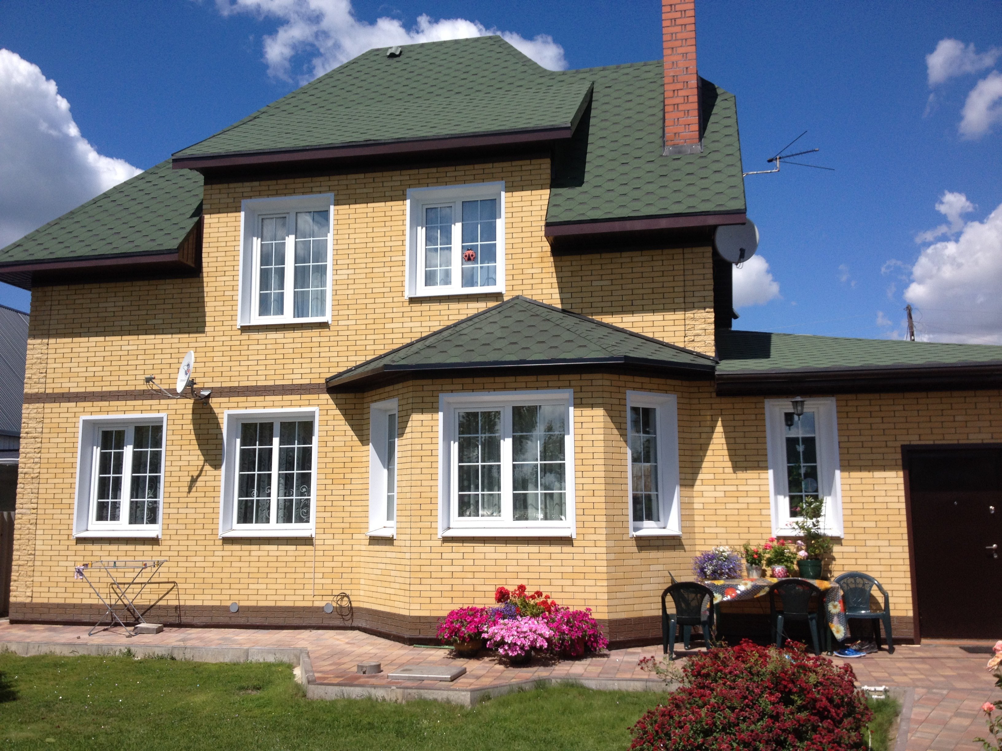 Кирпичный дом с зеленой крышей