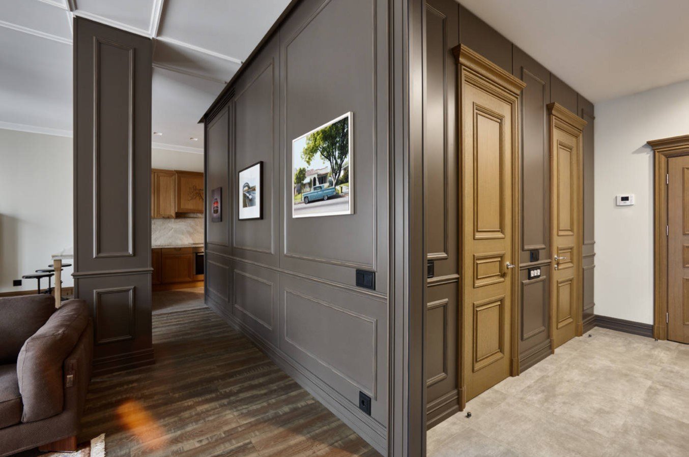 Серые двери в деревянном интерьере