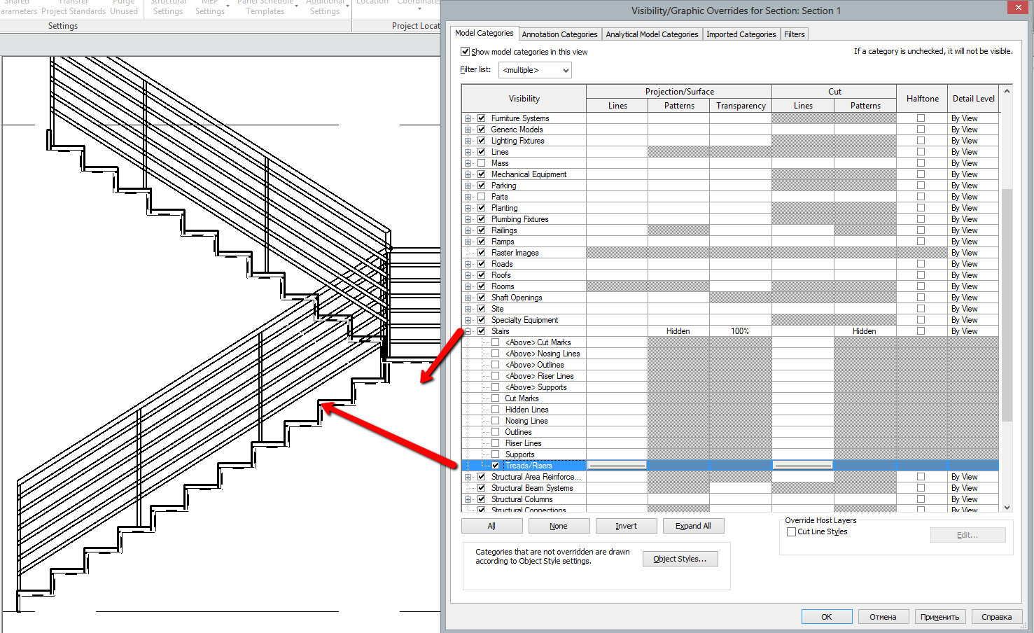 Отображение лестниц на плане ревит