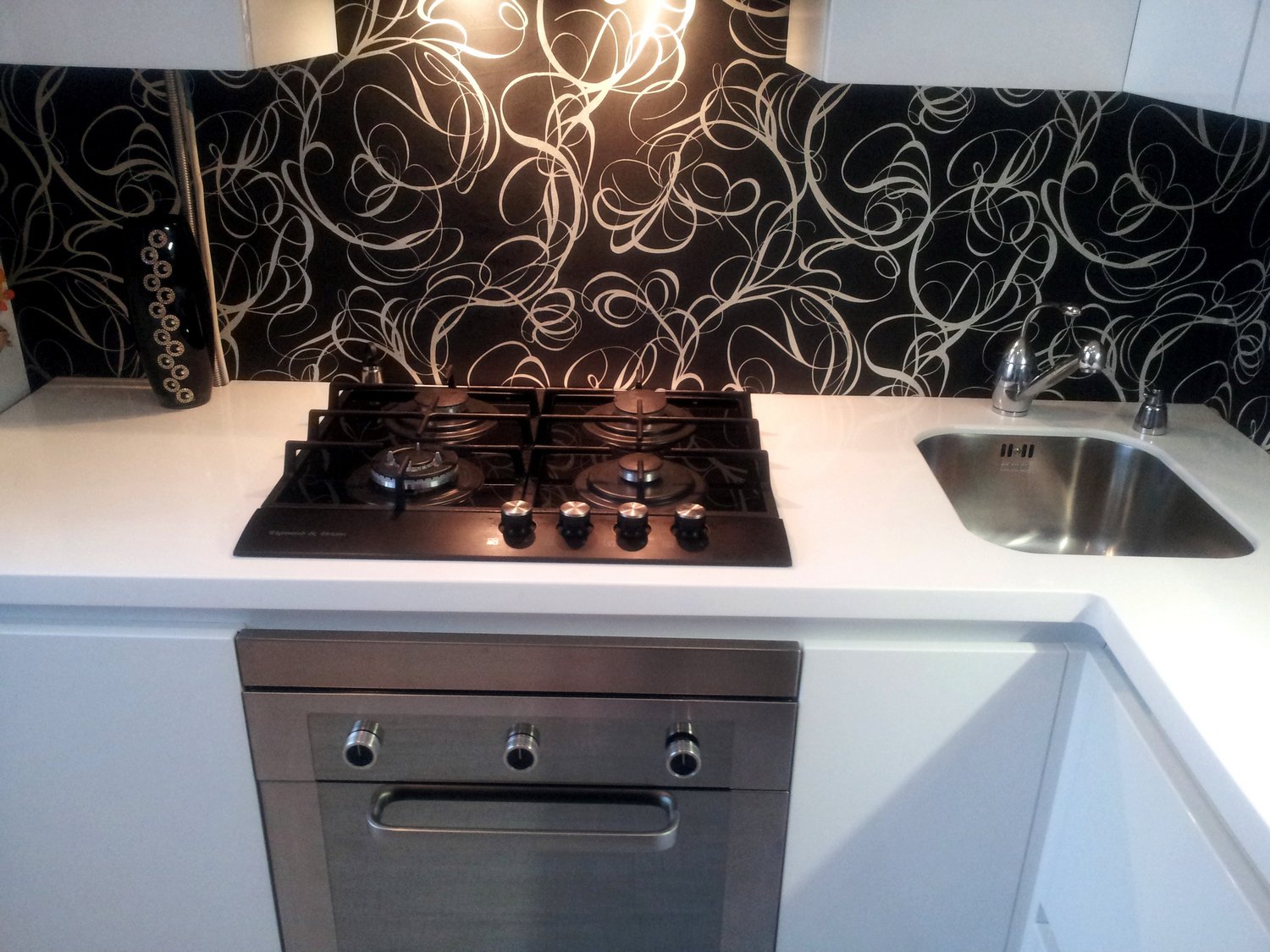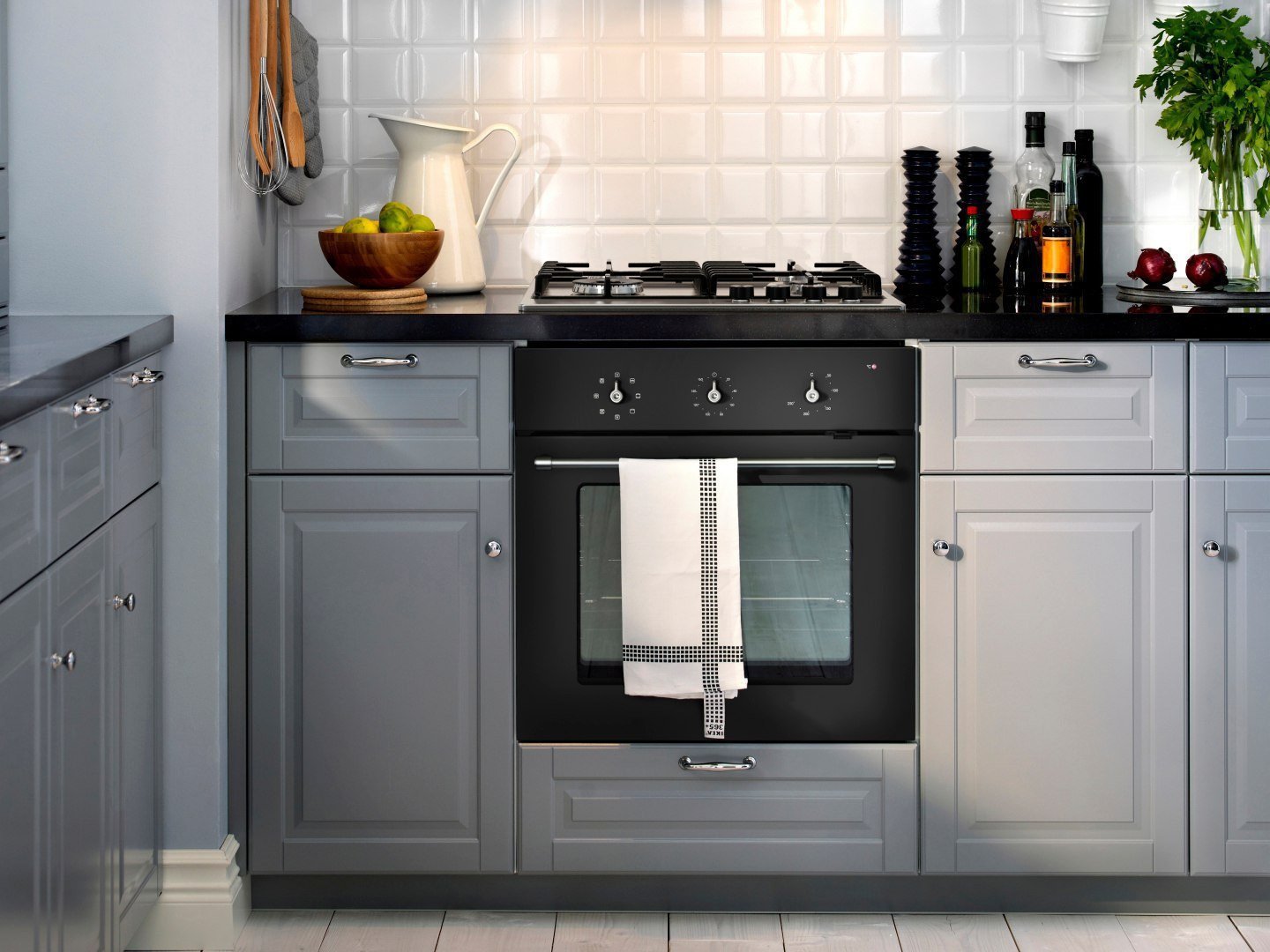 Белая кухня с черной духовкой и варочной панелью