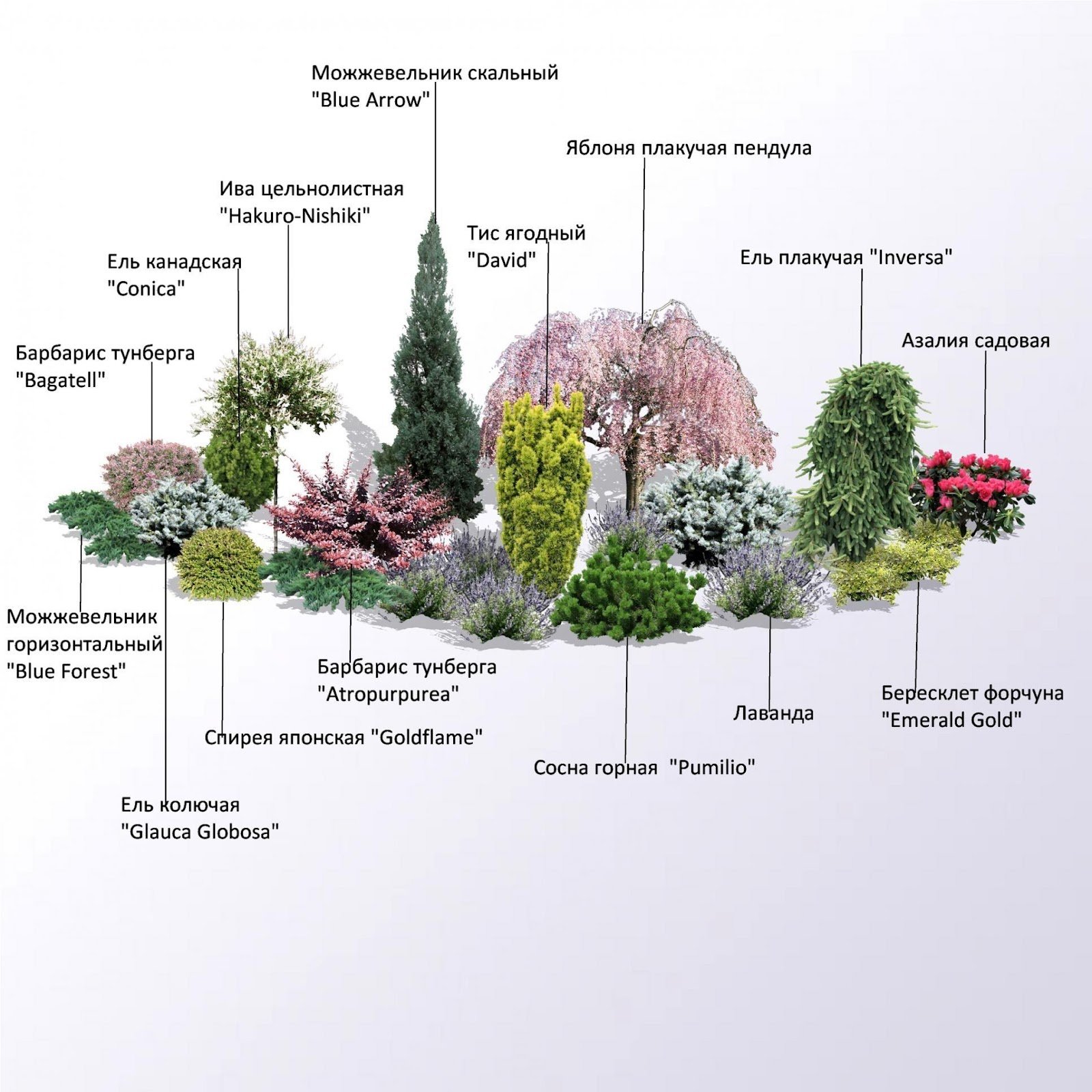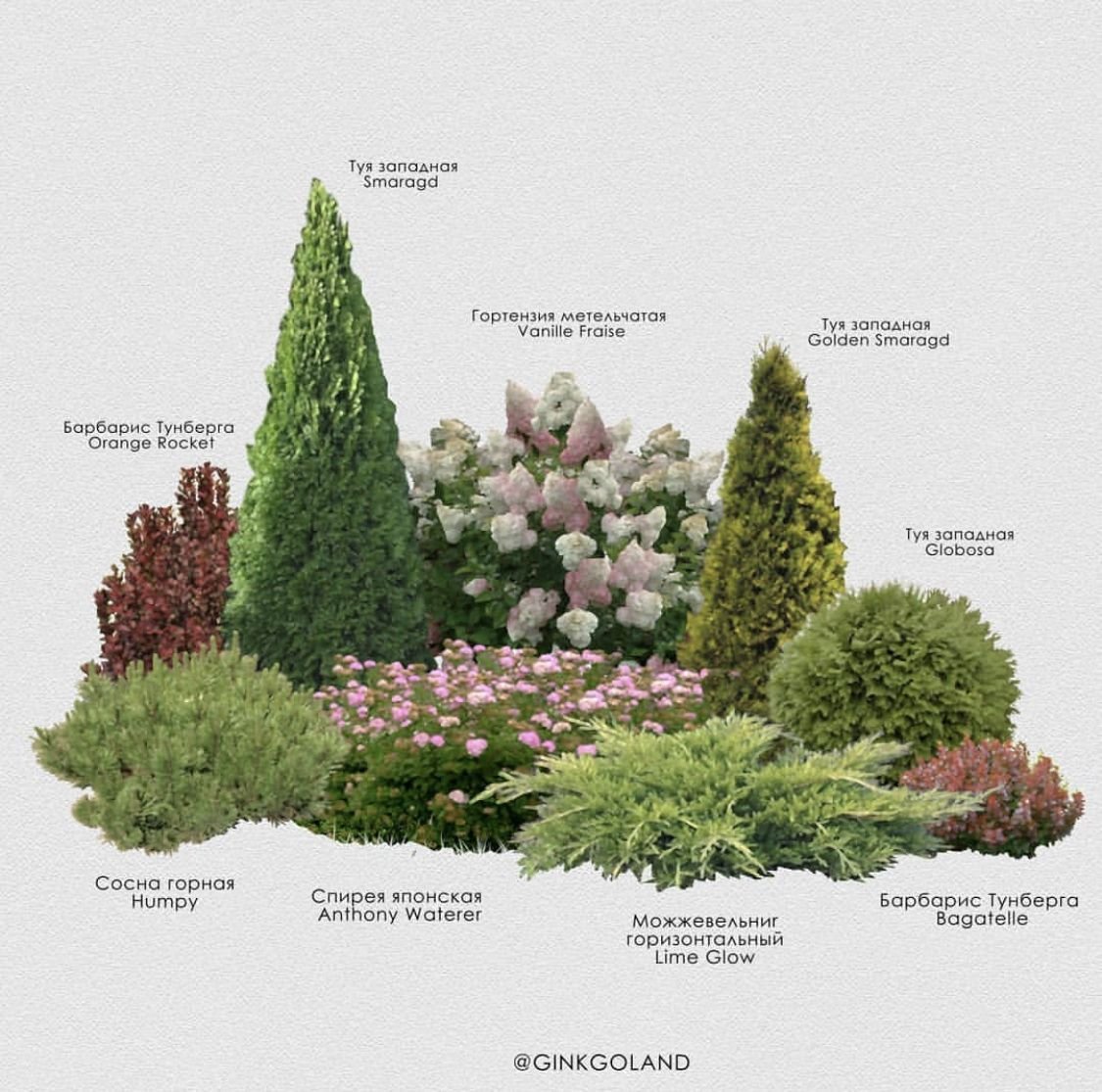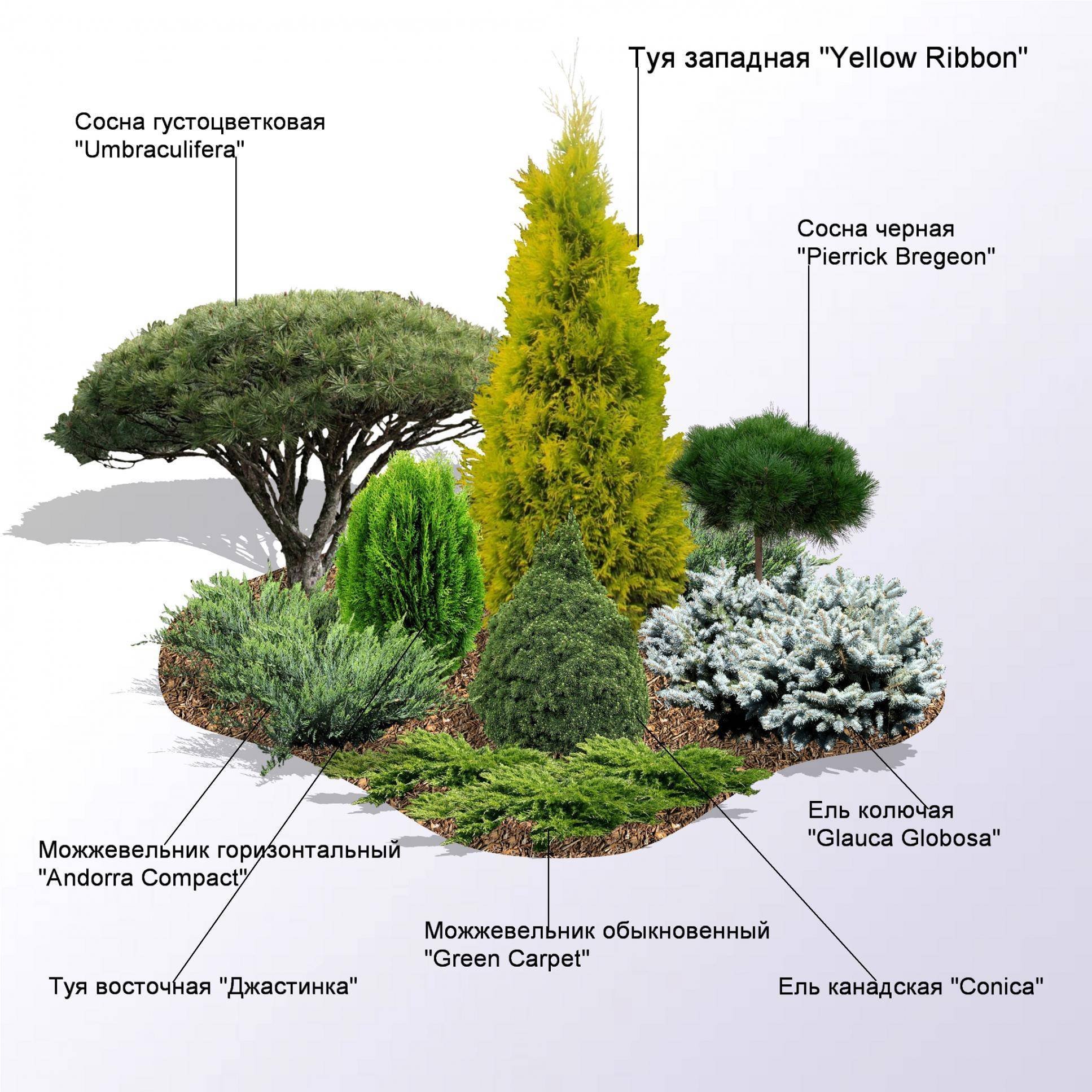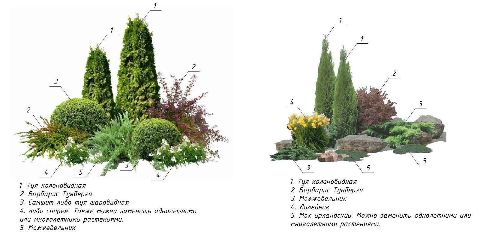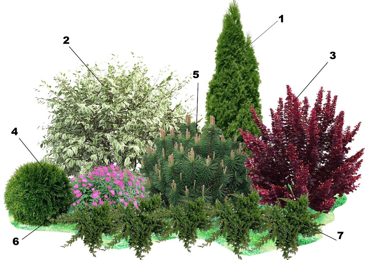 Миксбордер из хвойных и кустарников схемы вдоль забора