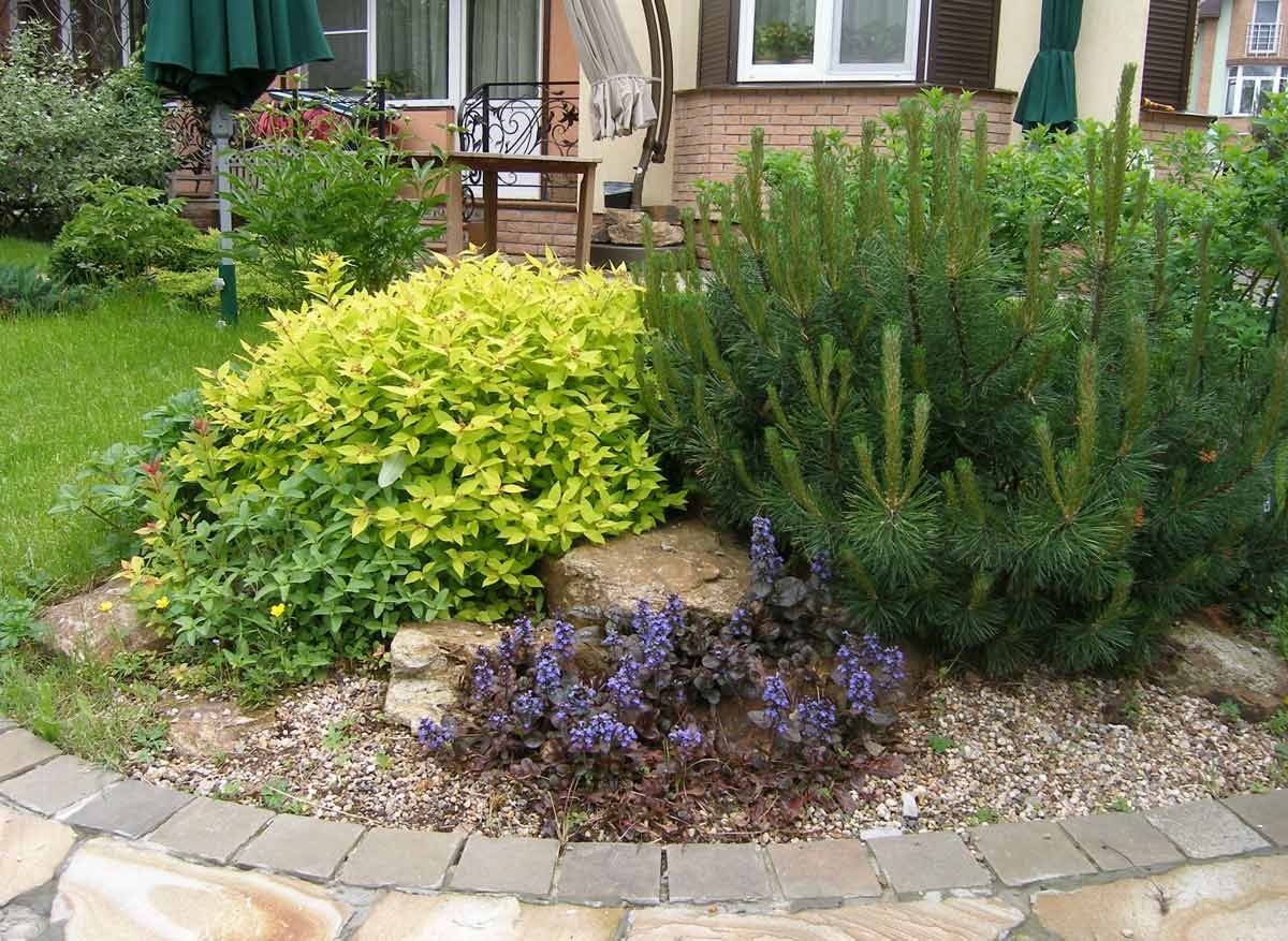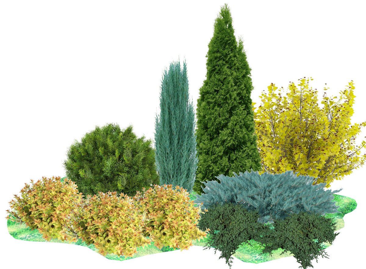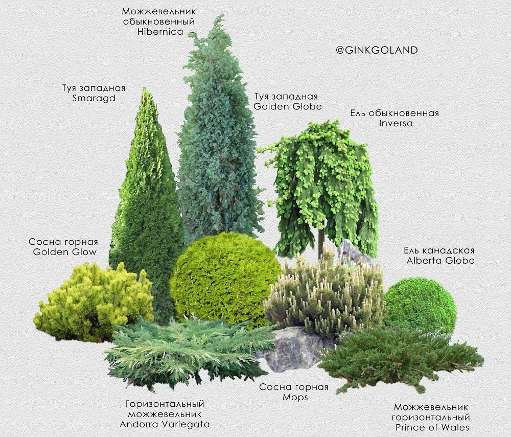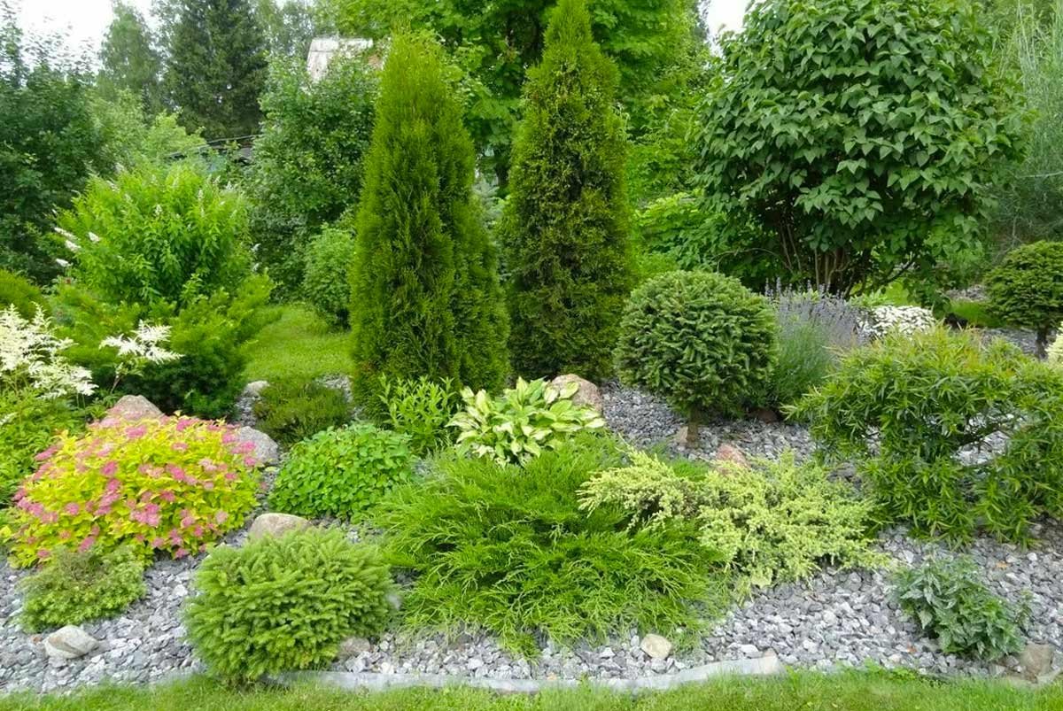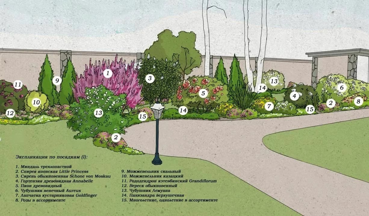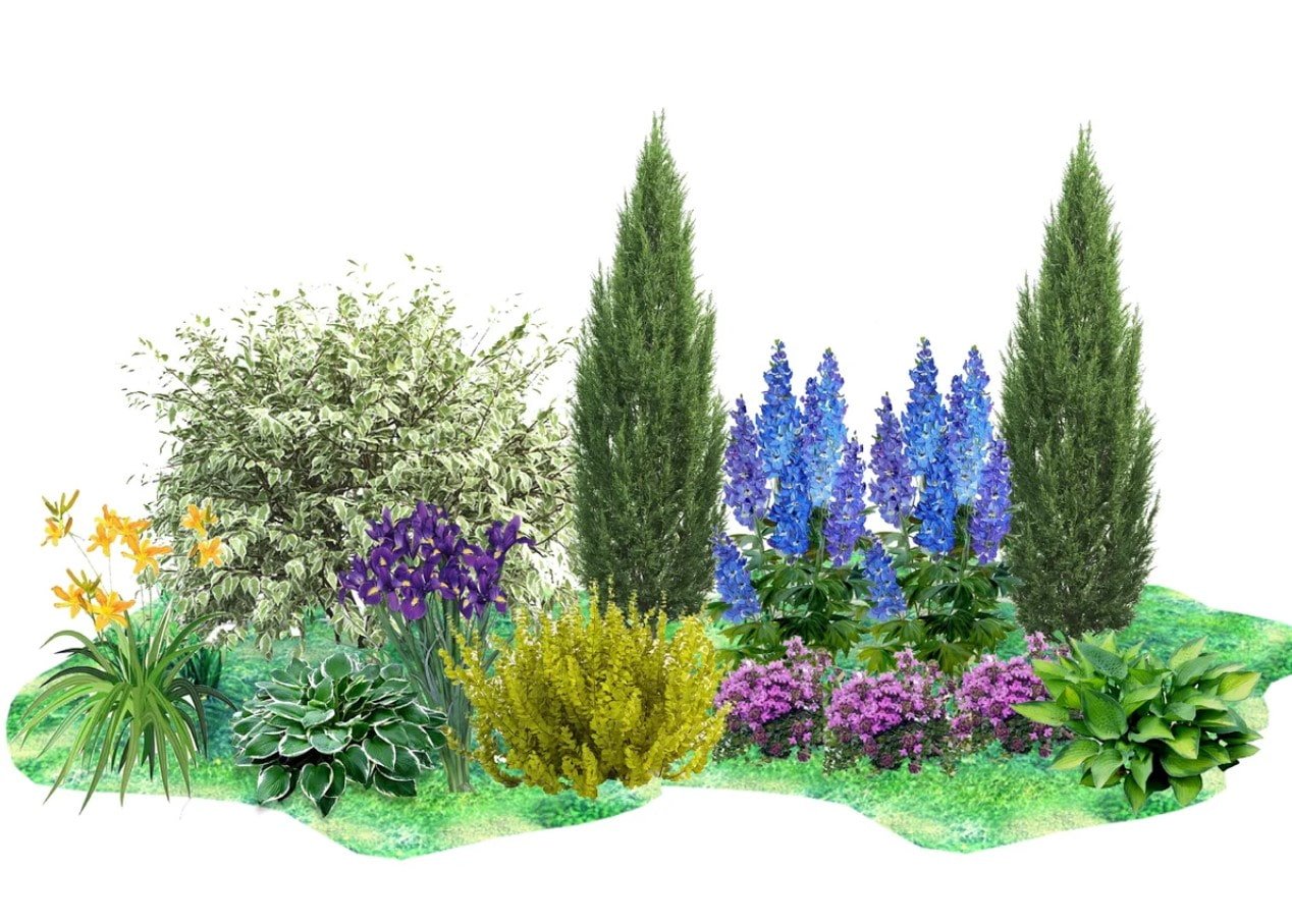 Миксбордер из хвойных и кустарников схемы вдоль забора