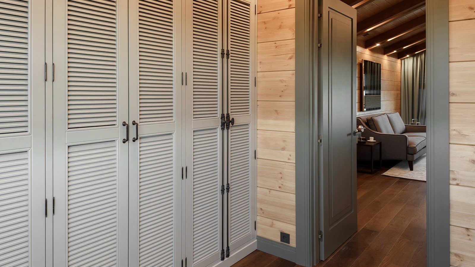 Жалюзийные двери в интерьере деревянного дома
