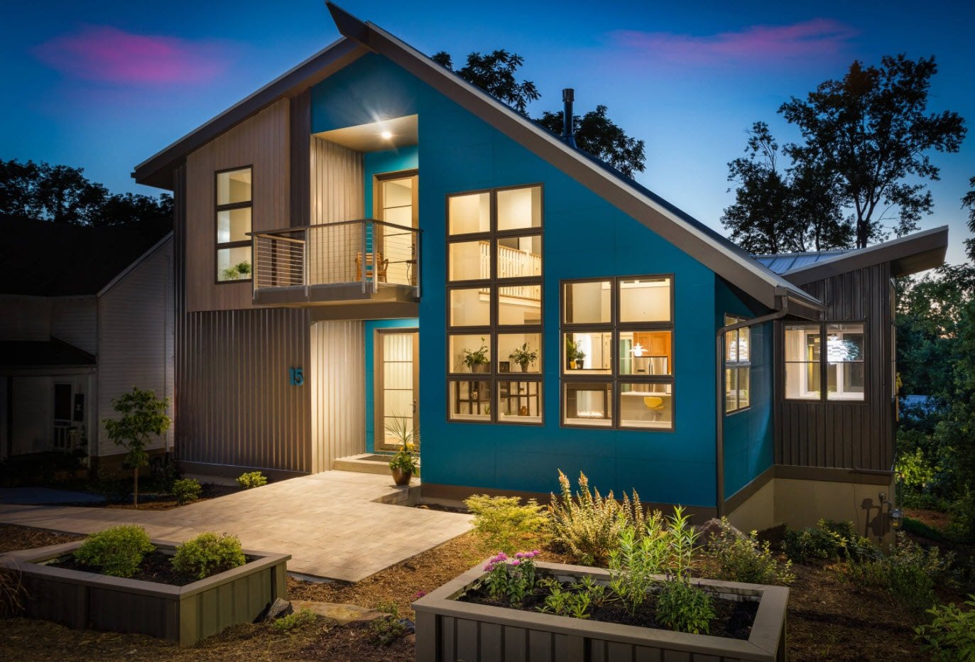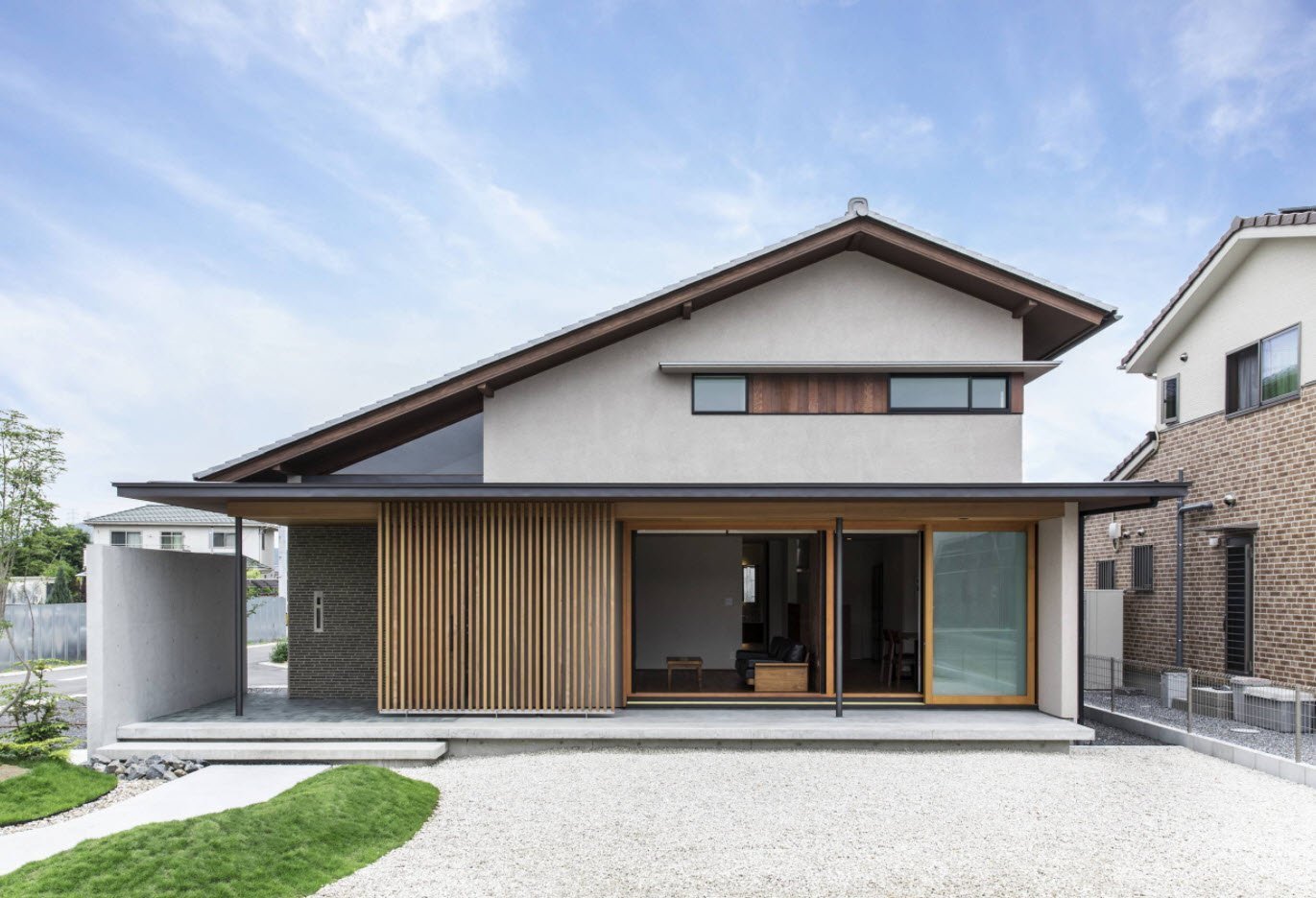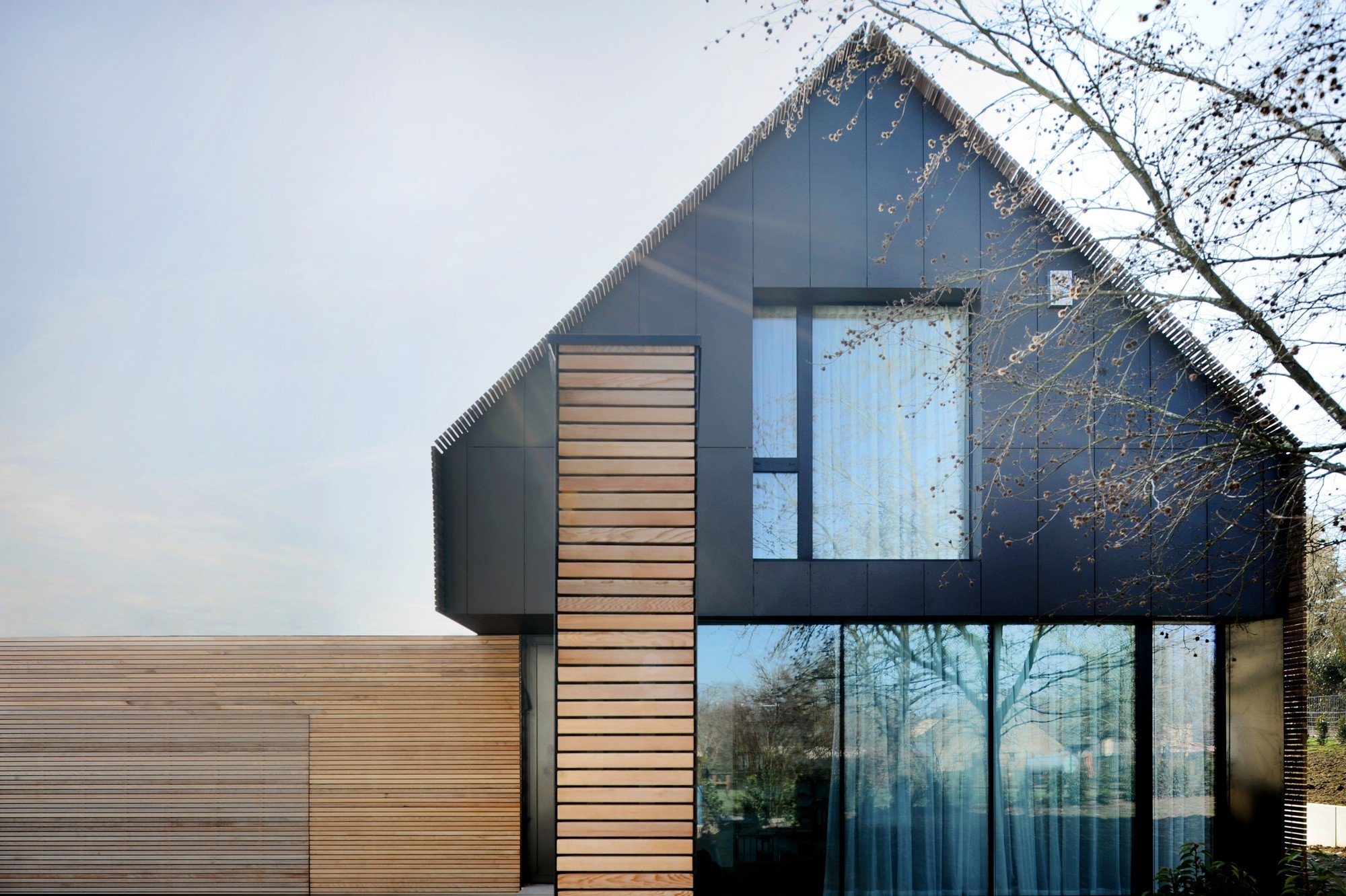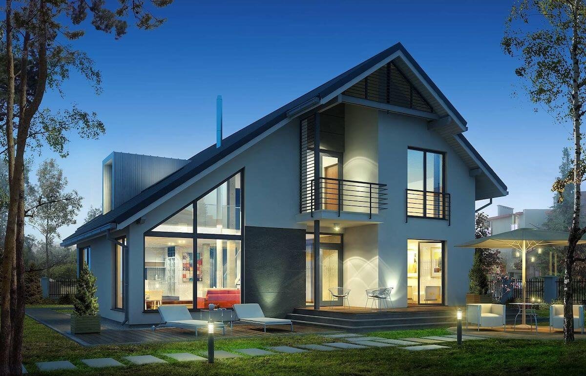 Фасад дома с двускатной крышей в современном стиле