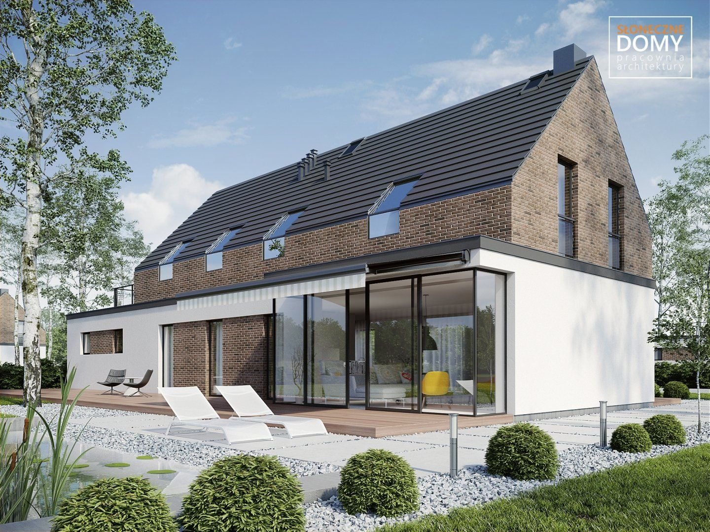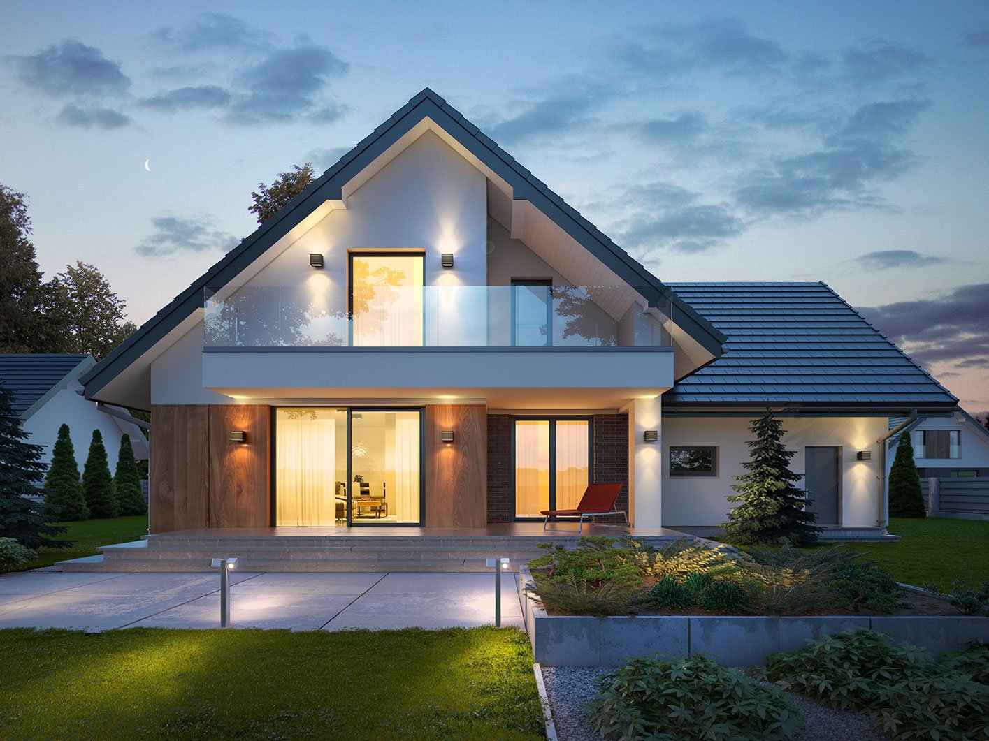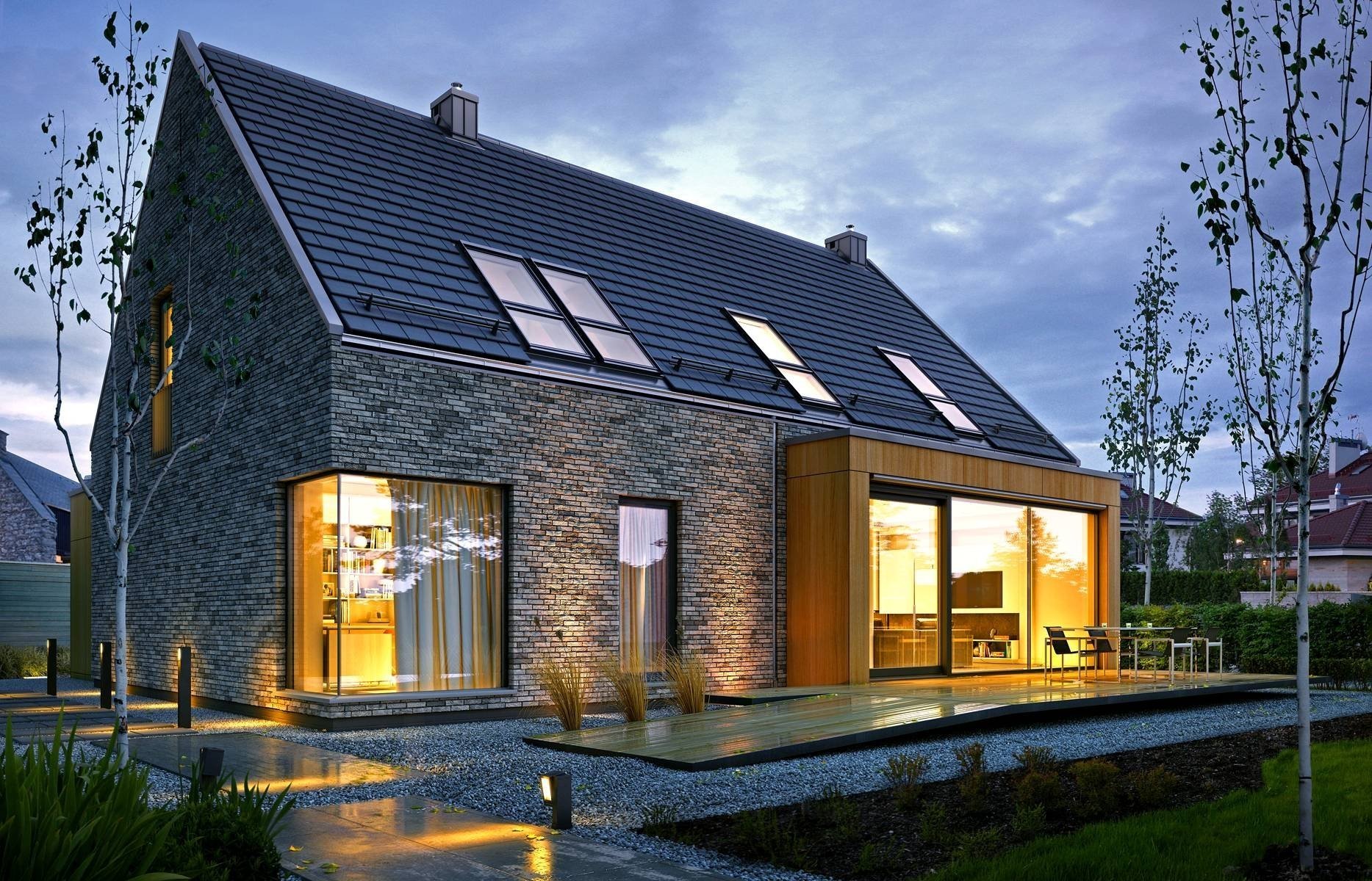 Двухэтажный дом с мансардной крышей и панорамными окнами