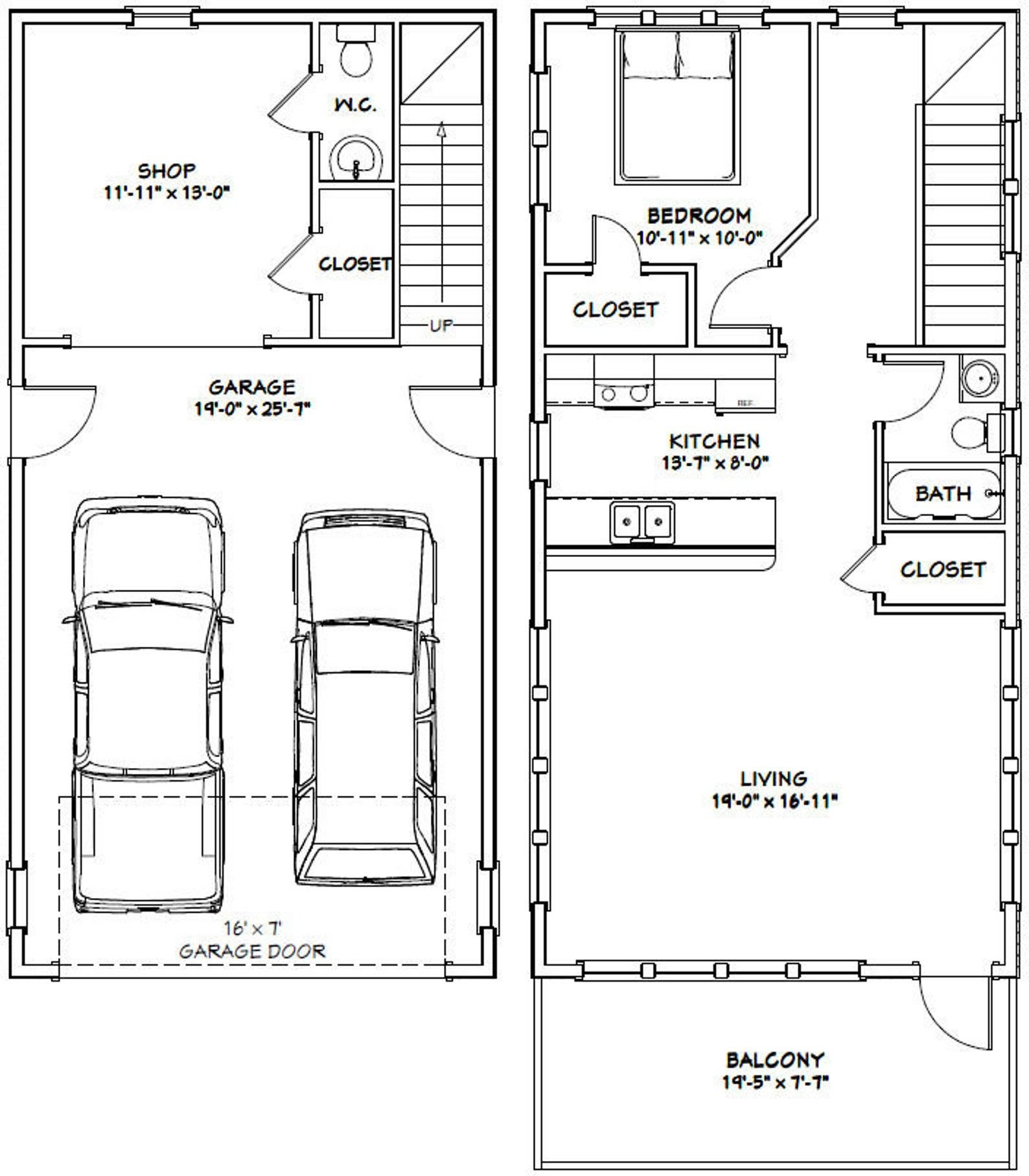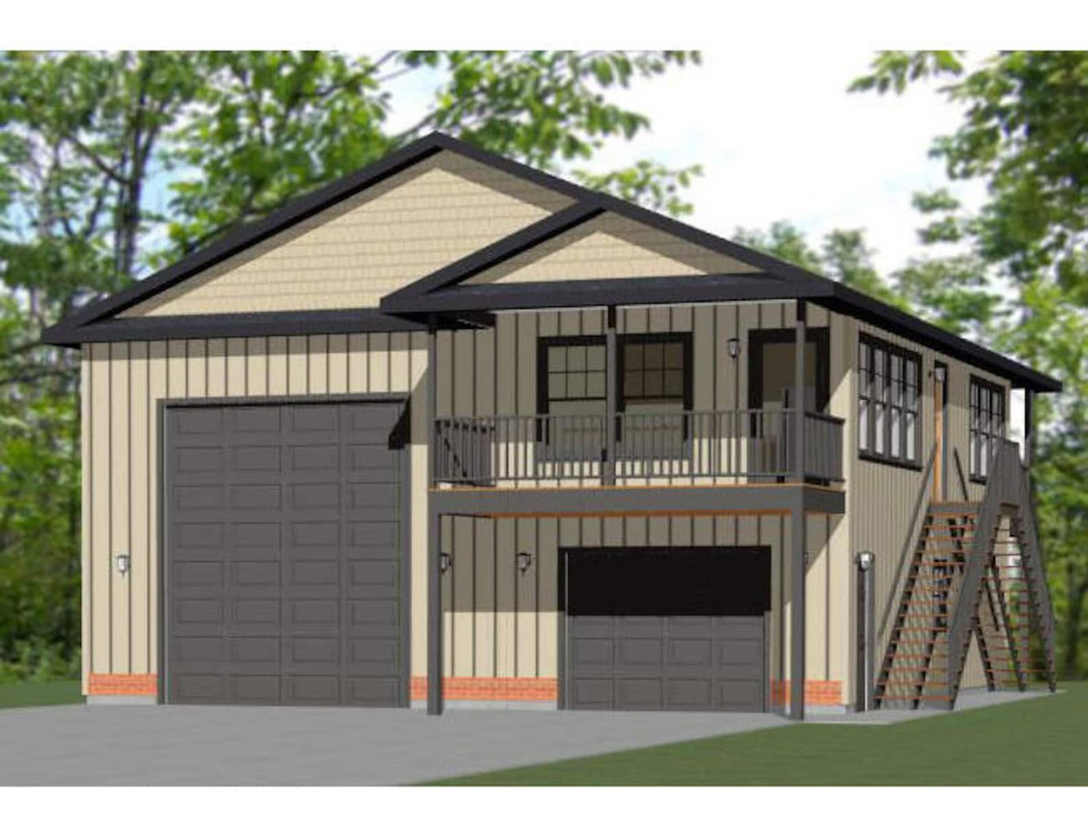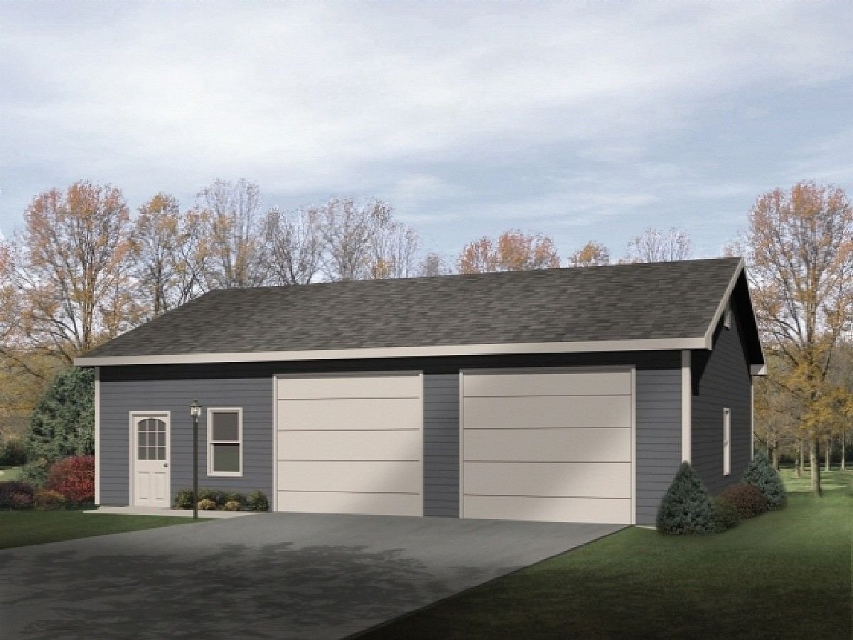 План двухэтажного гаража на 2 машины с двумя воротами с жилой комнатой