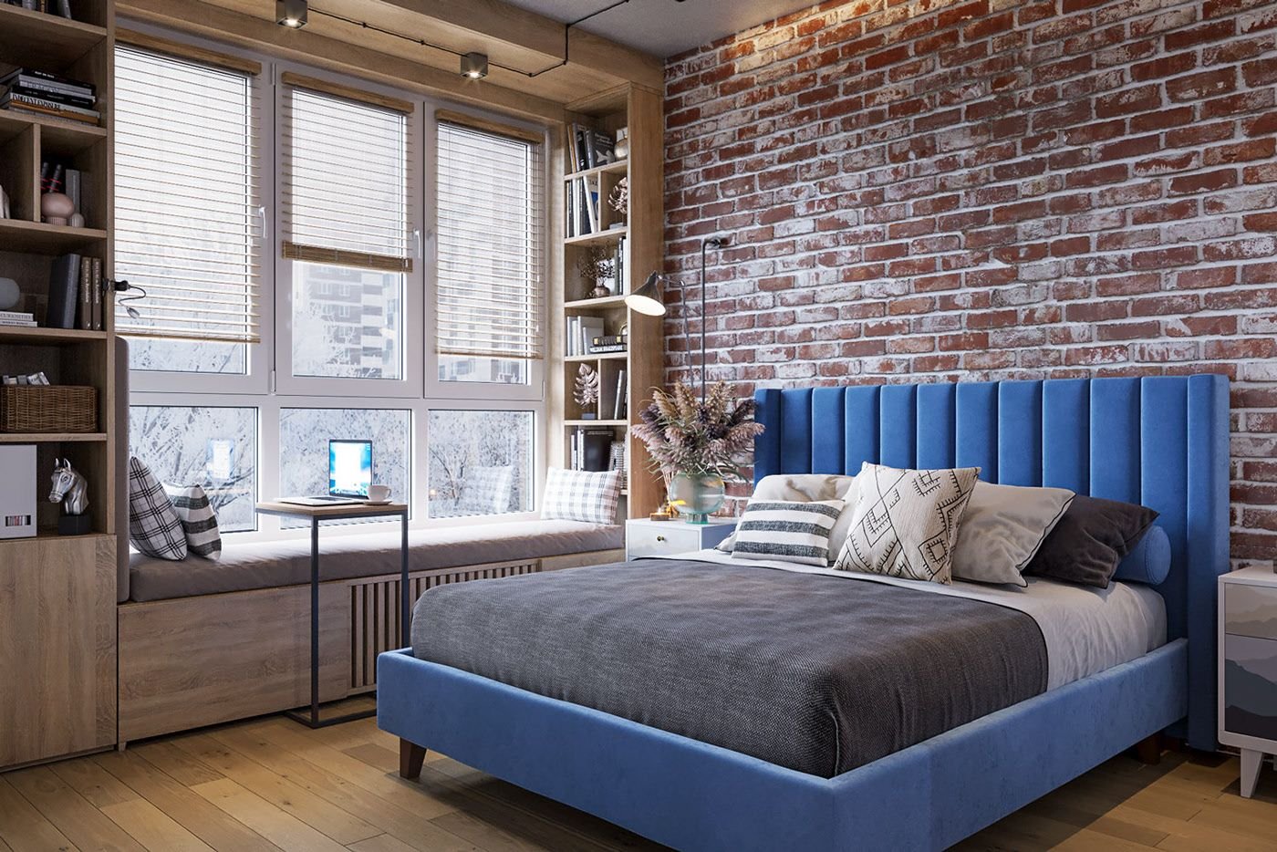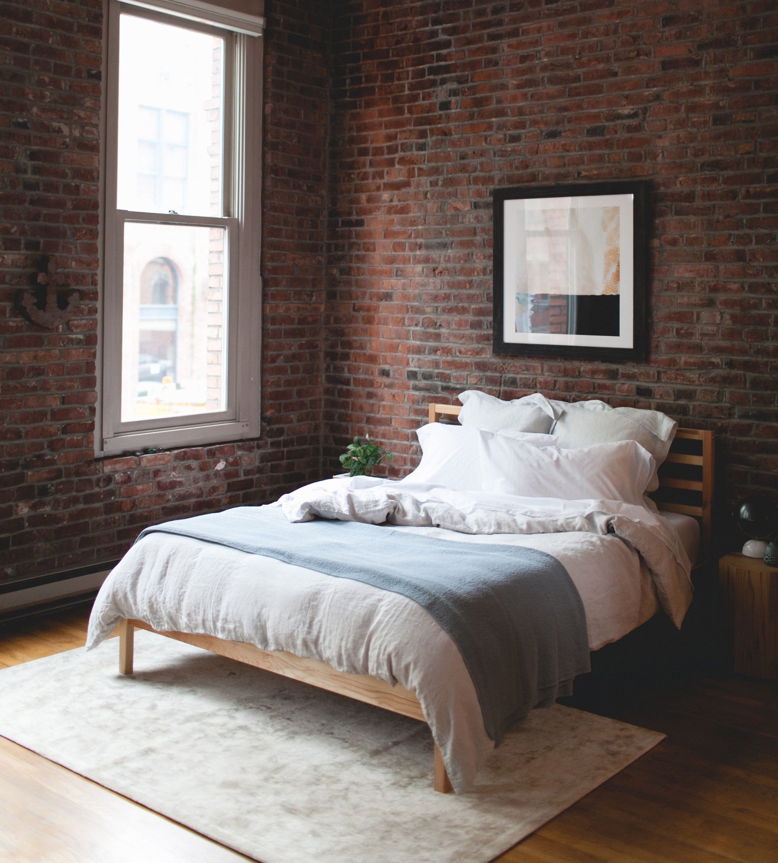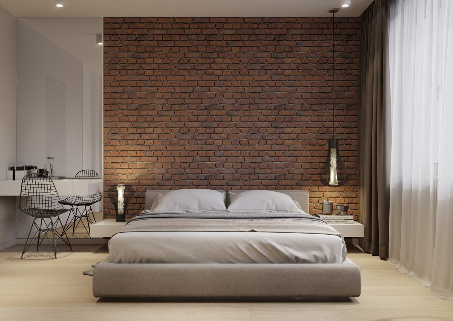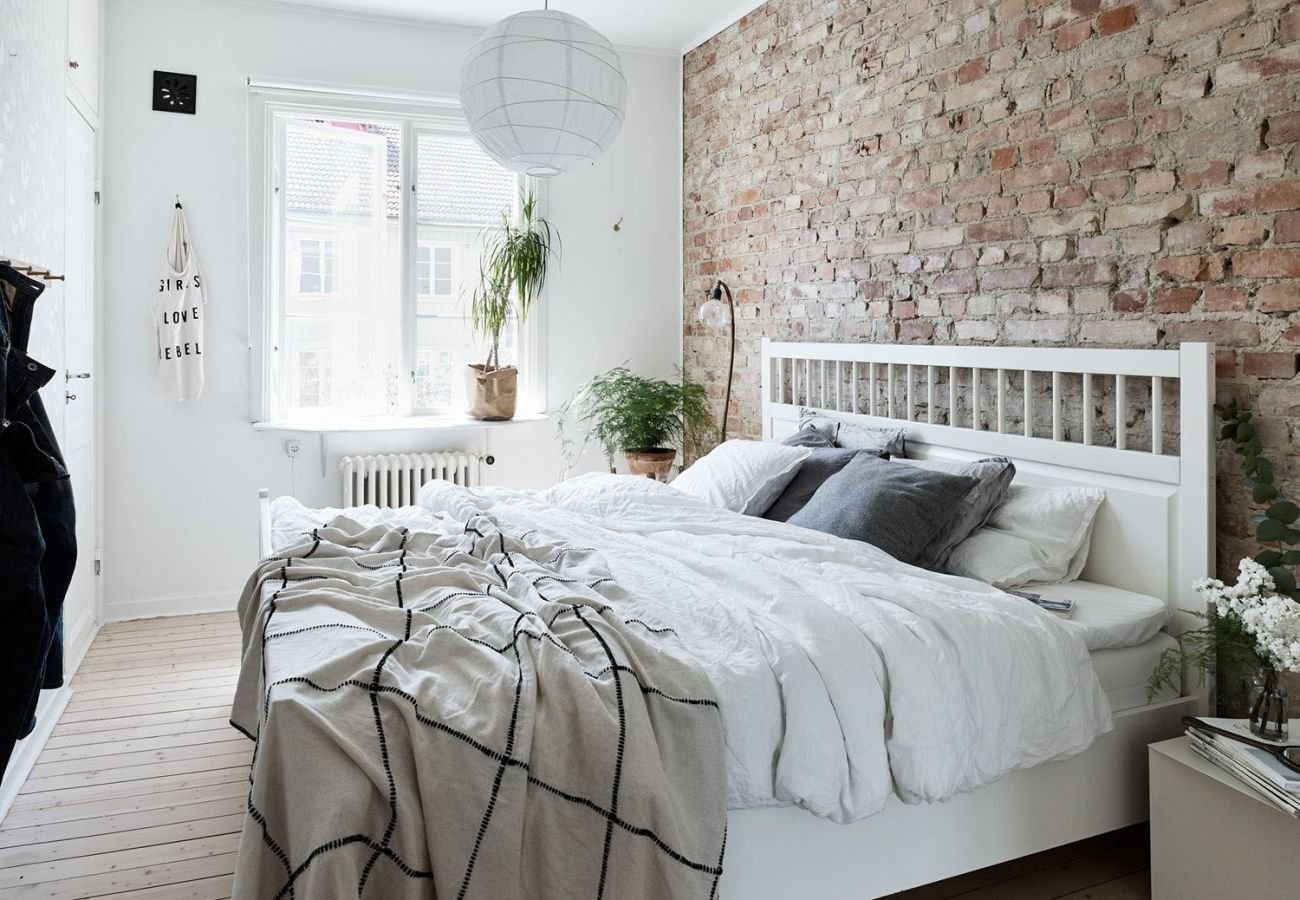 Спальня в скандинавском стиле с кирпичной стеной