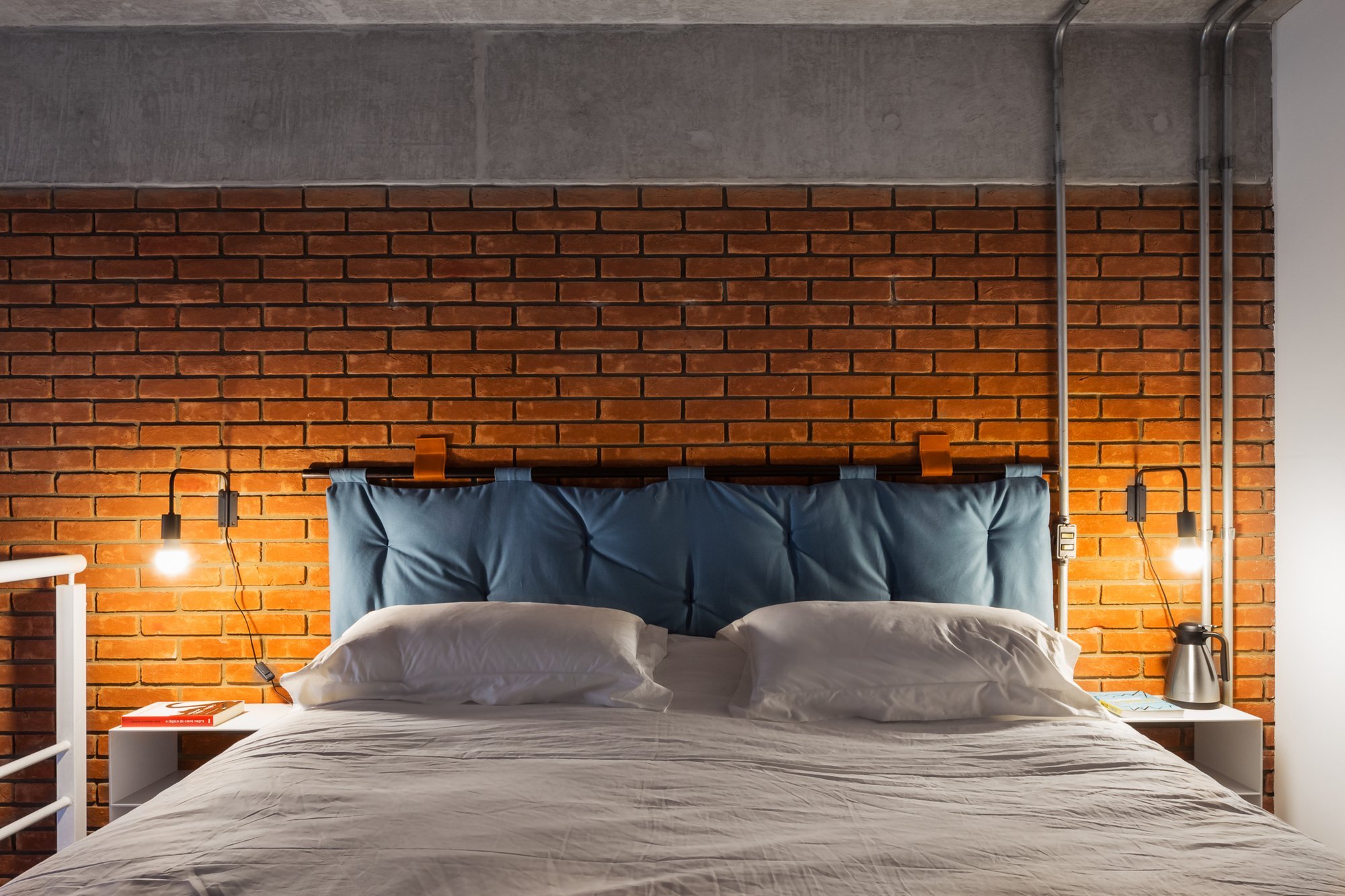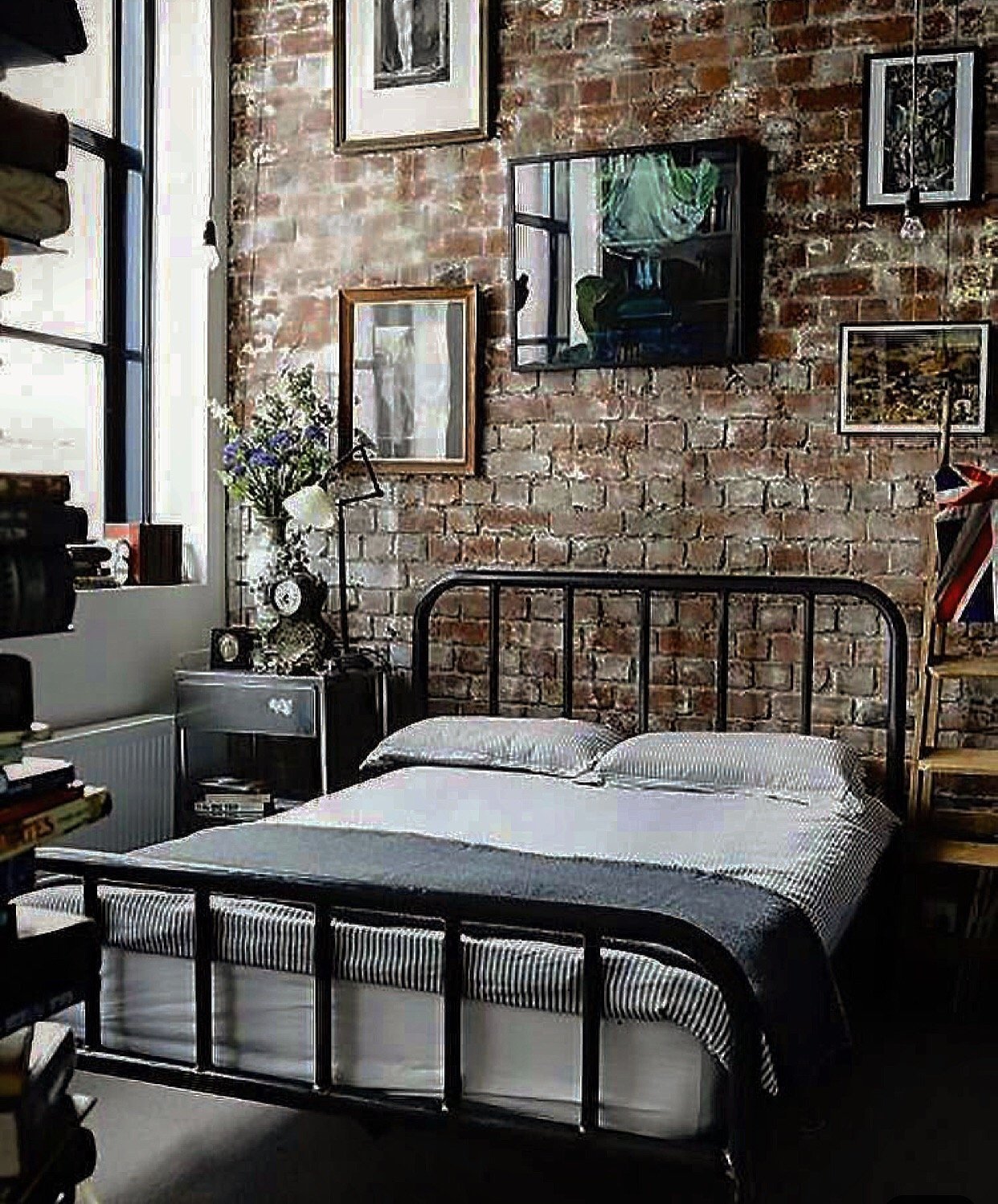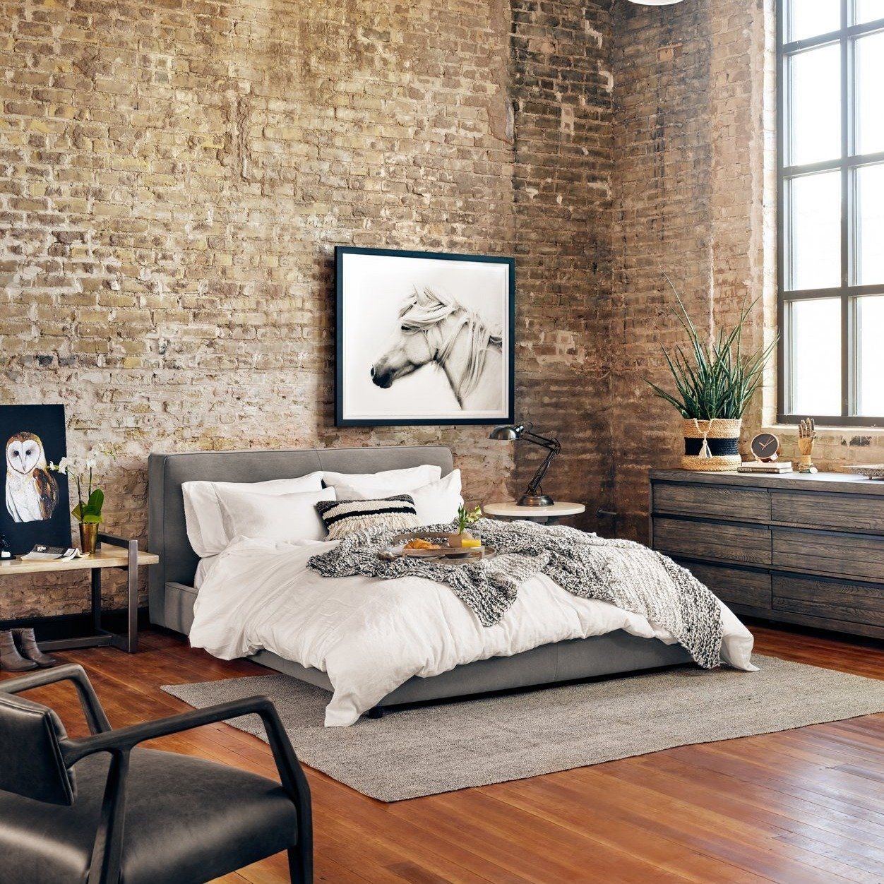 Спальня в скандинавском стиле с кирпичной стеной