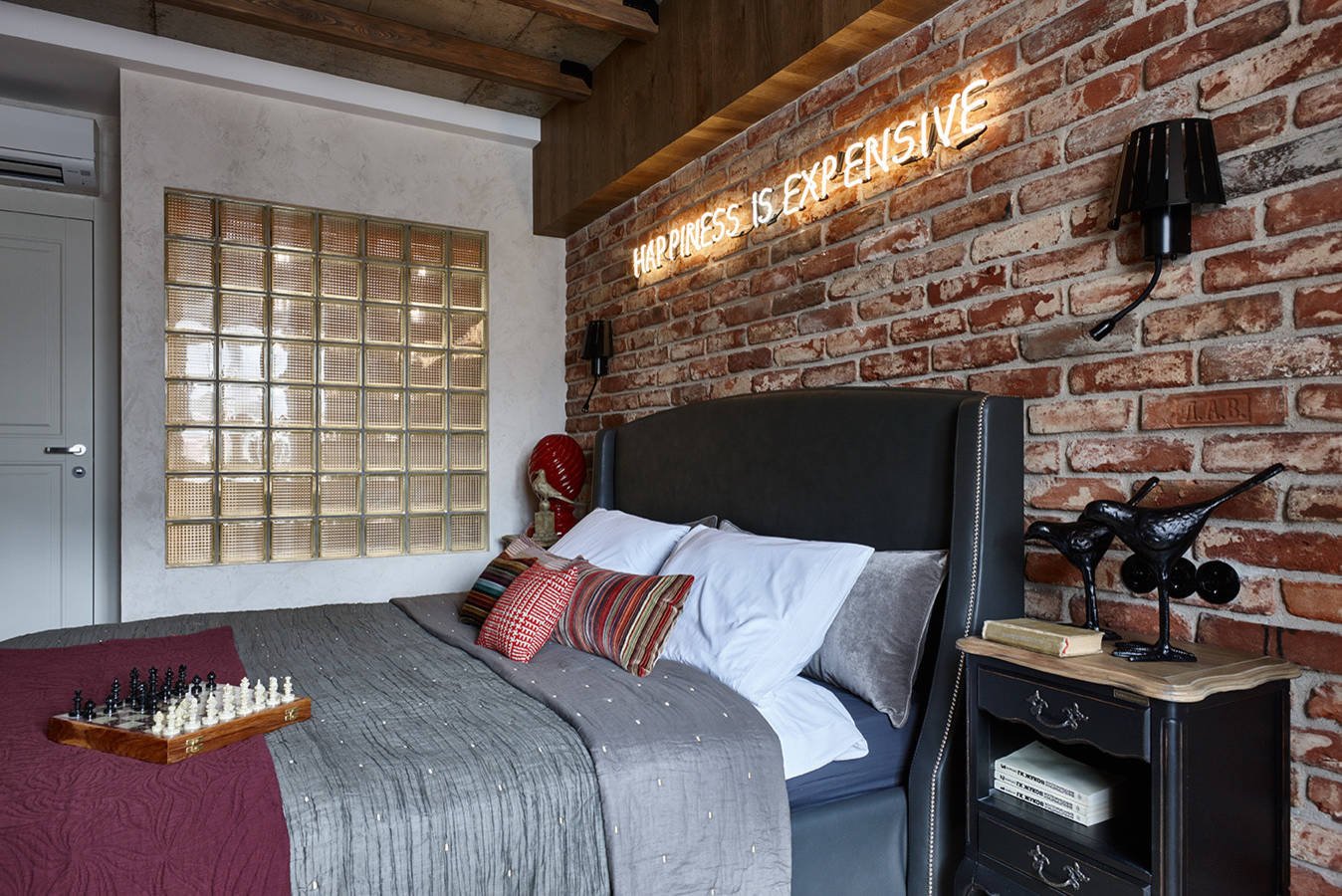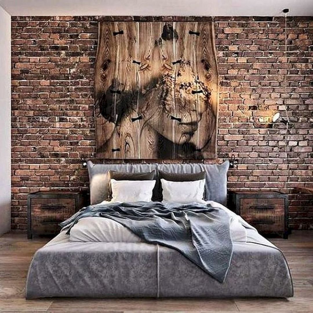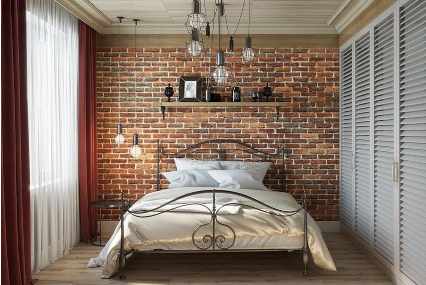Кирпичная стена в интерьере спальни