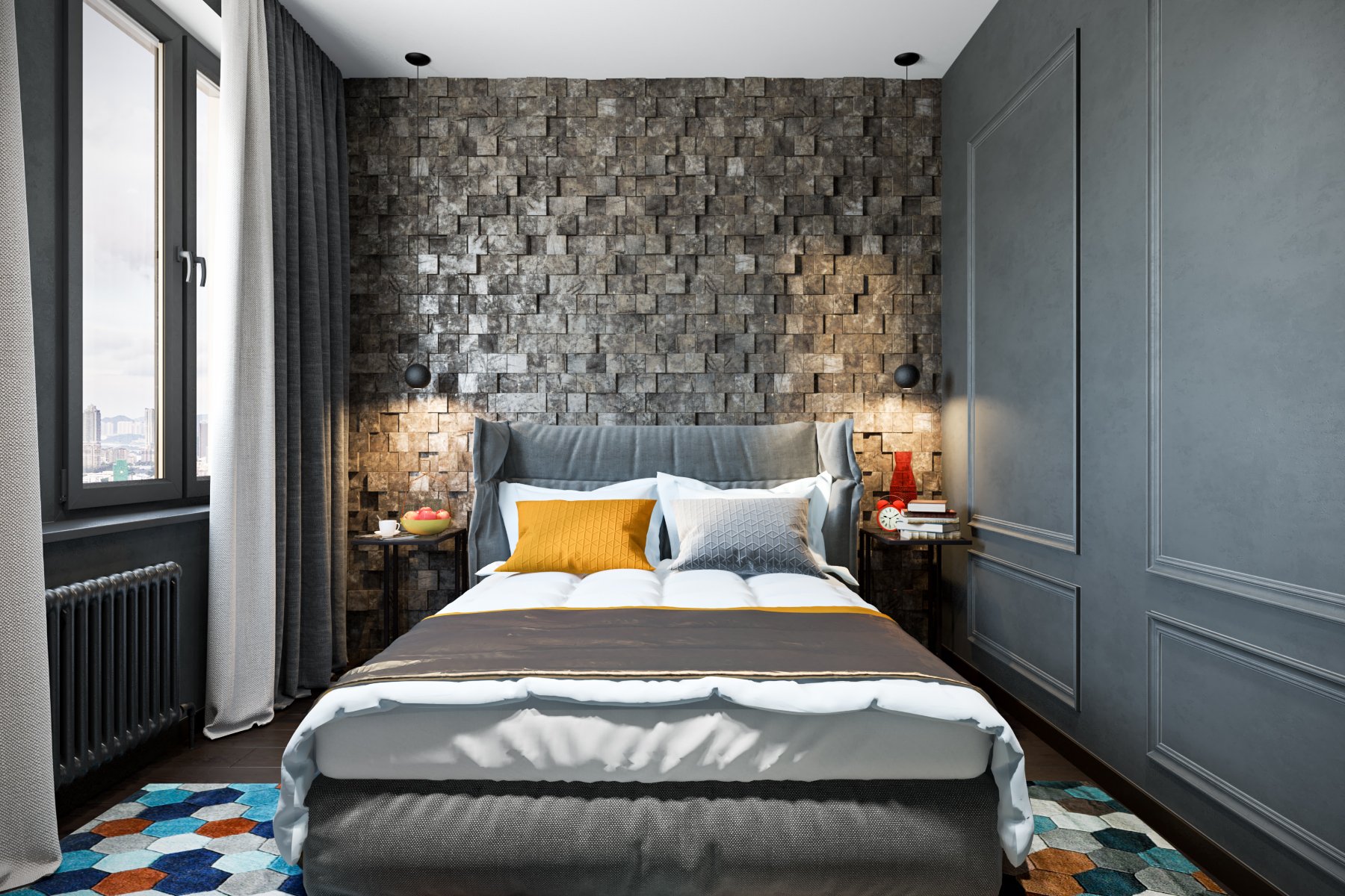 Спальня с акцентной стеной за кроватью
