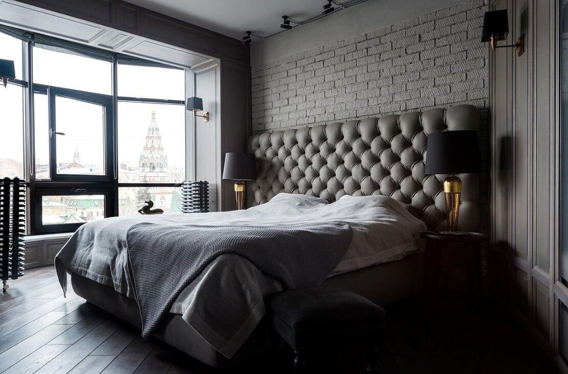 Спальня в стиле лофт с мягкой кроватью