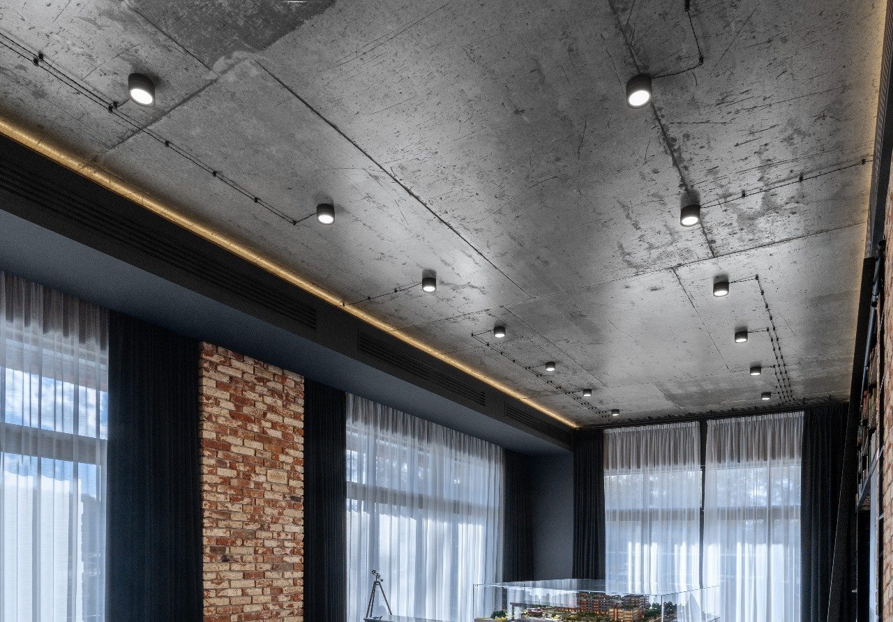 Потолок с трековыми светильниками