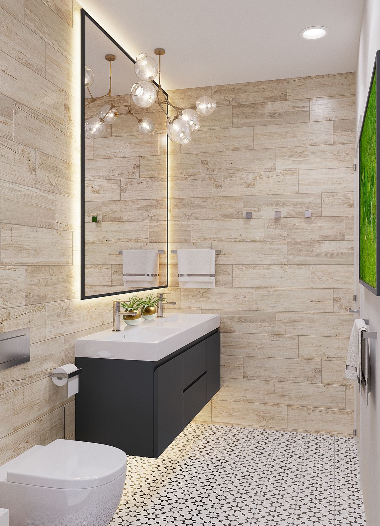 Ванная комната с плиткой под дерево и мрамор