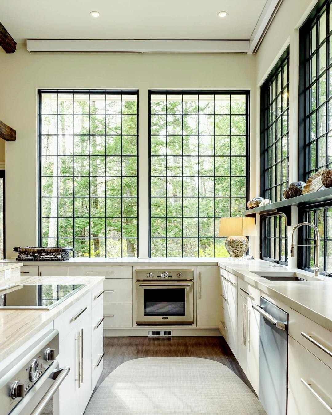 Окна в пол в загородном доме с подоконником