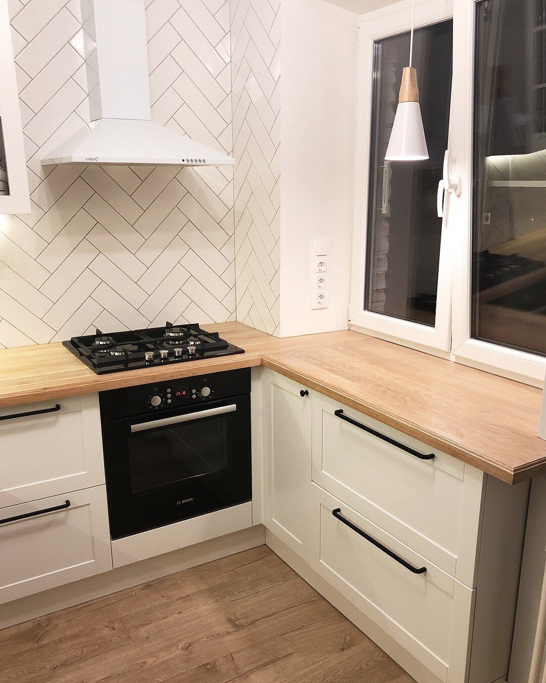 Белая кухня с деревянной столешницей