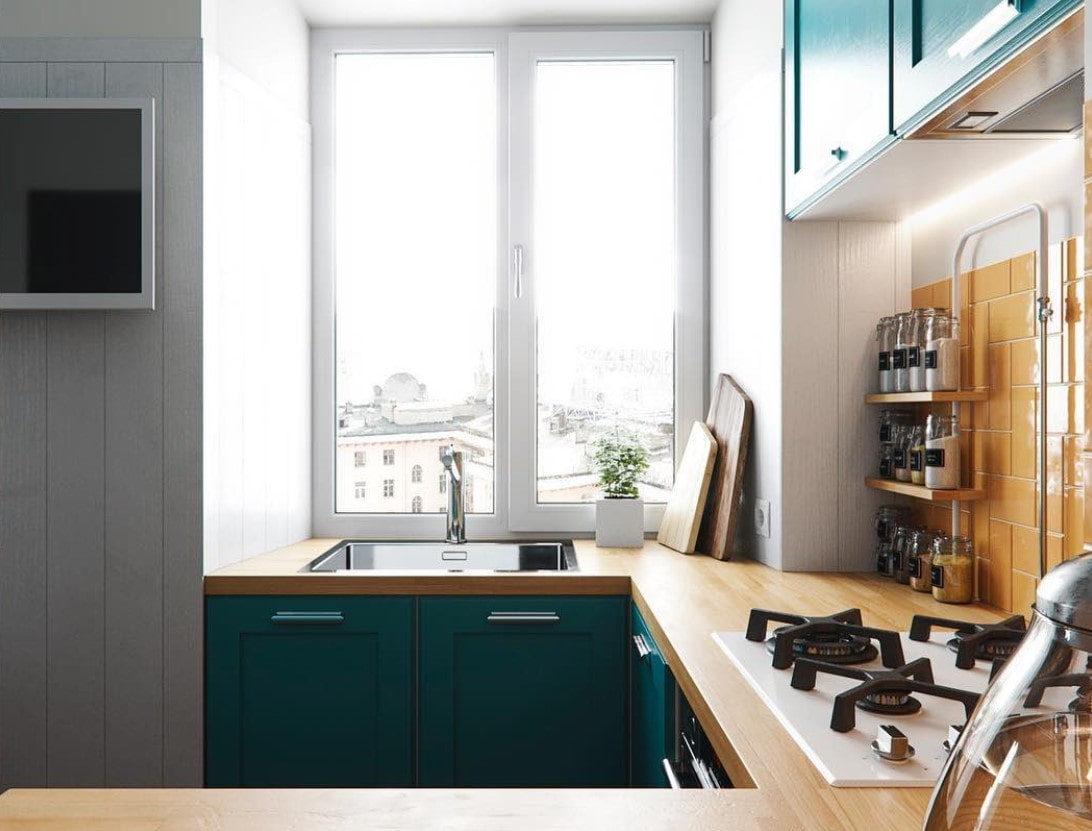 Узкая кухня с раковиной у окна