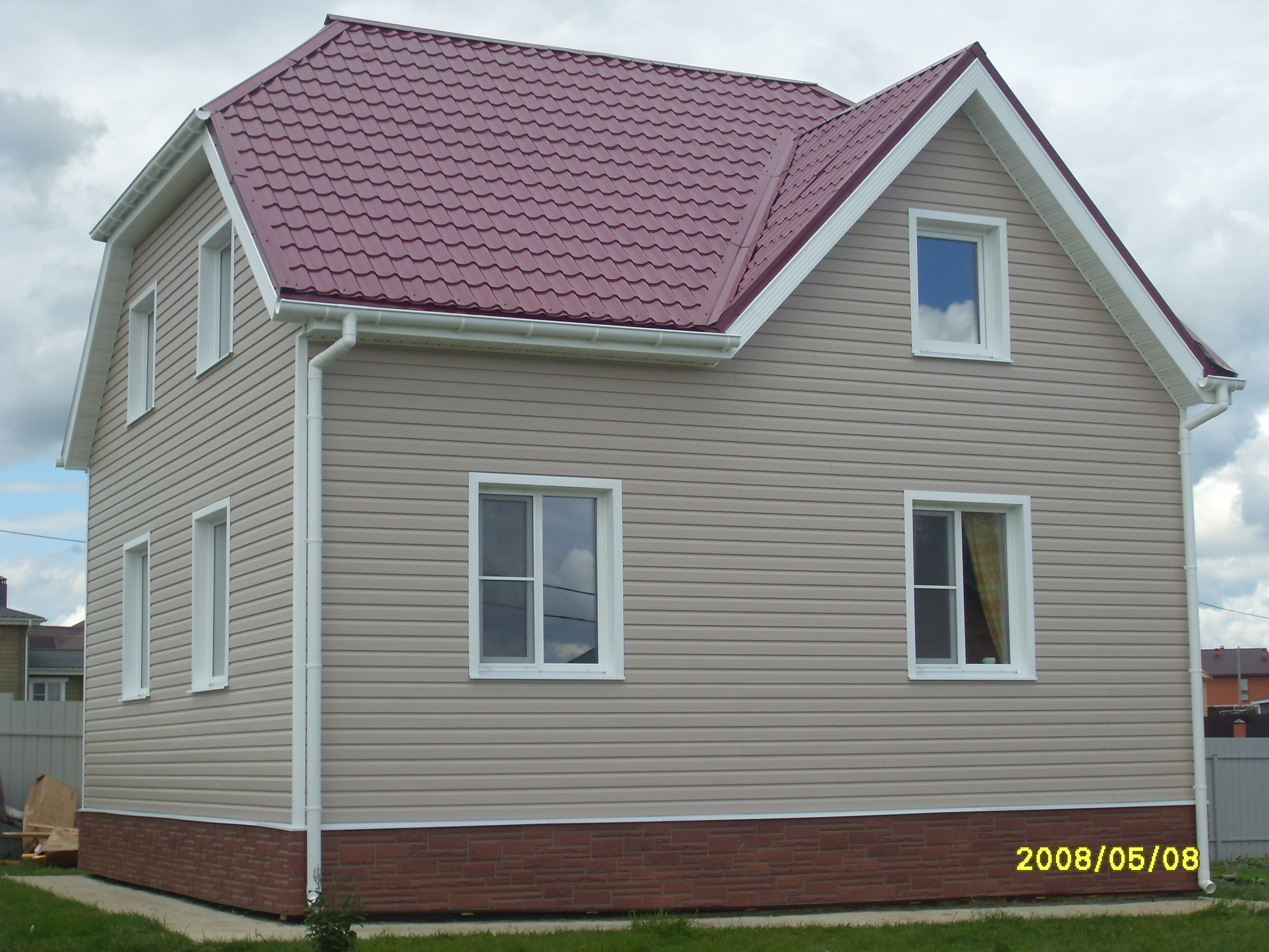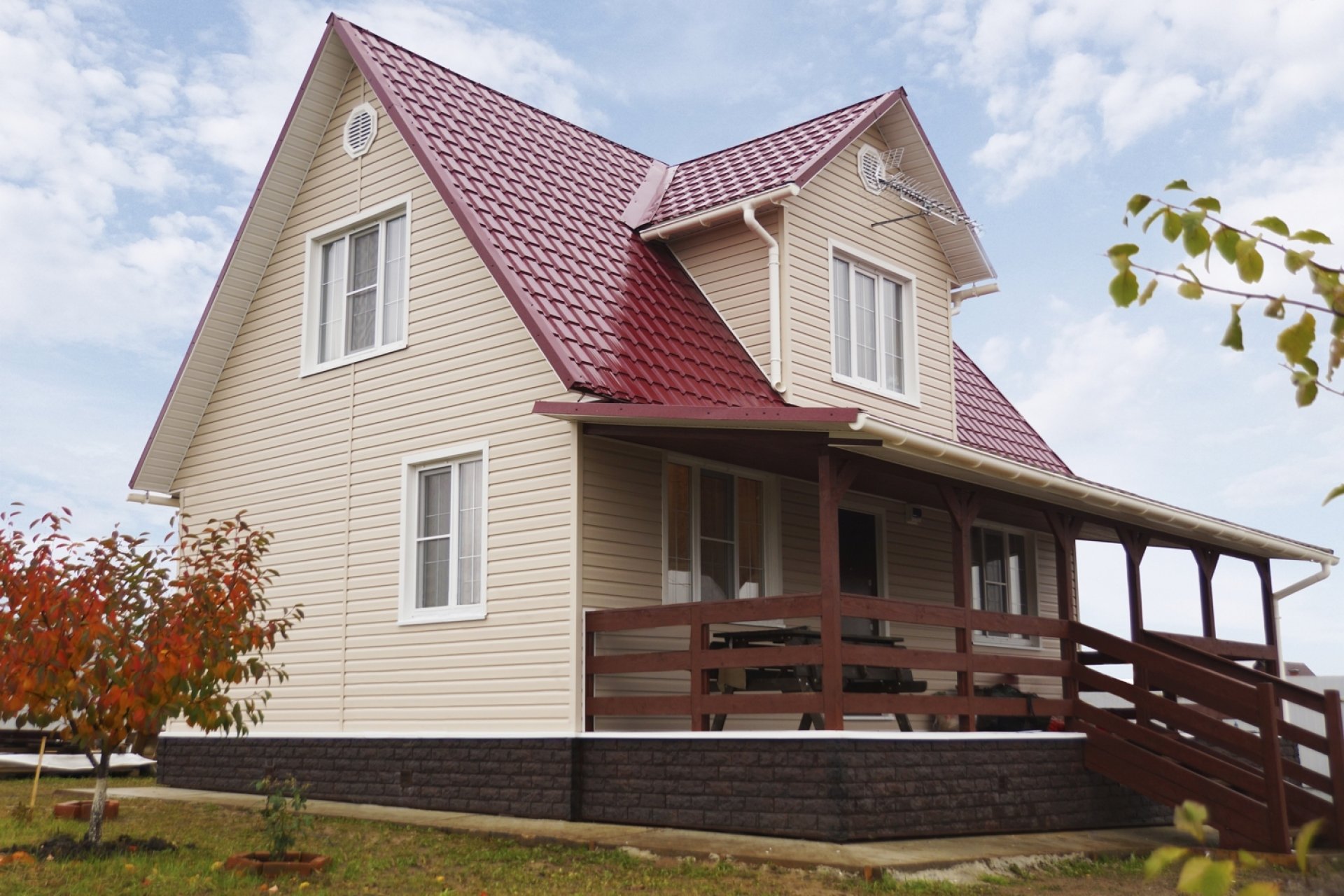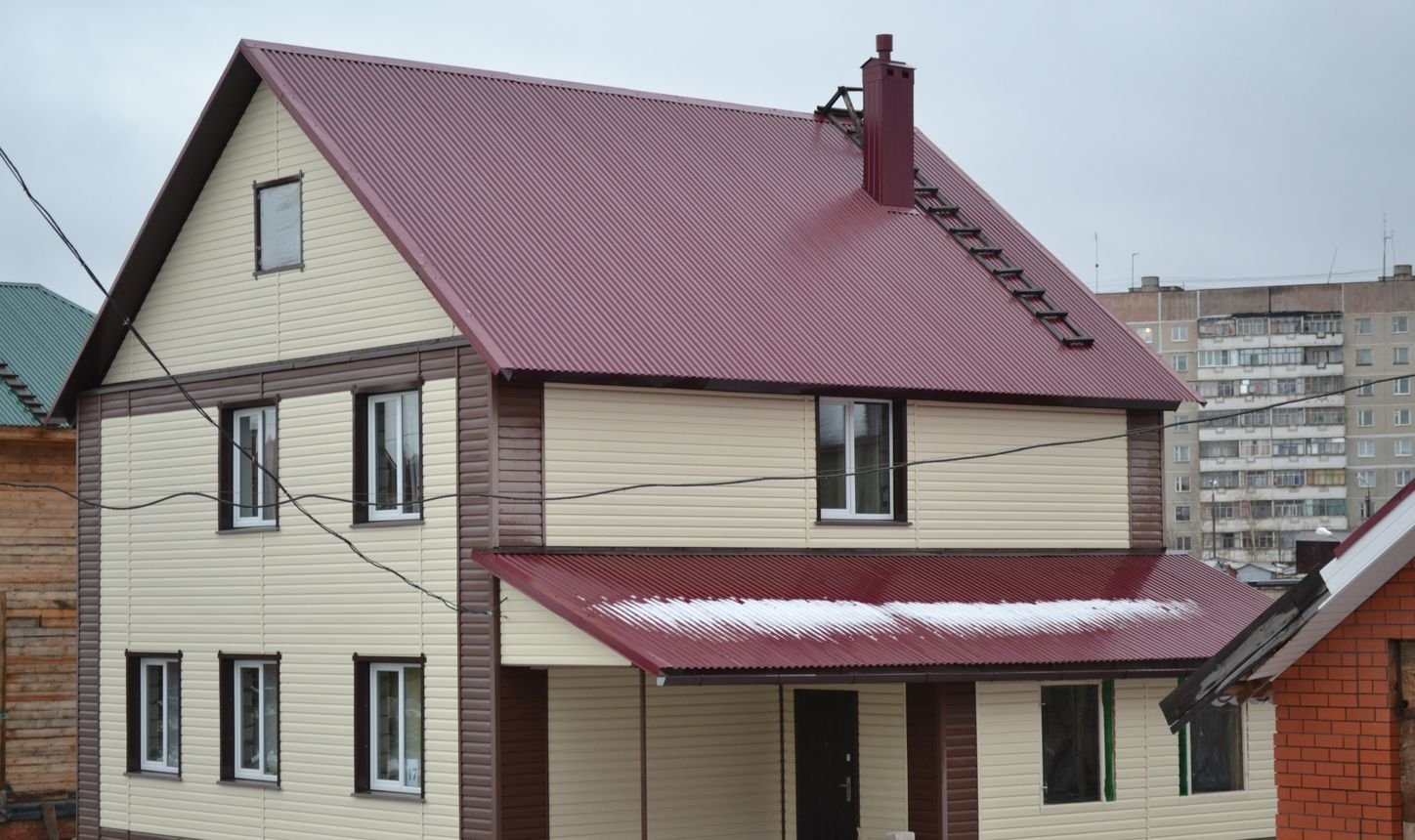 Дом с бордовой крышей и сайдингом