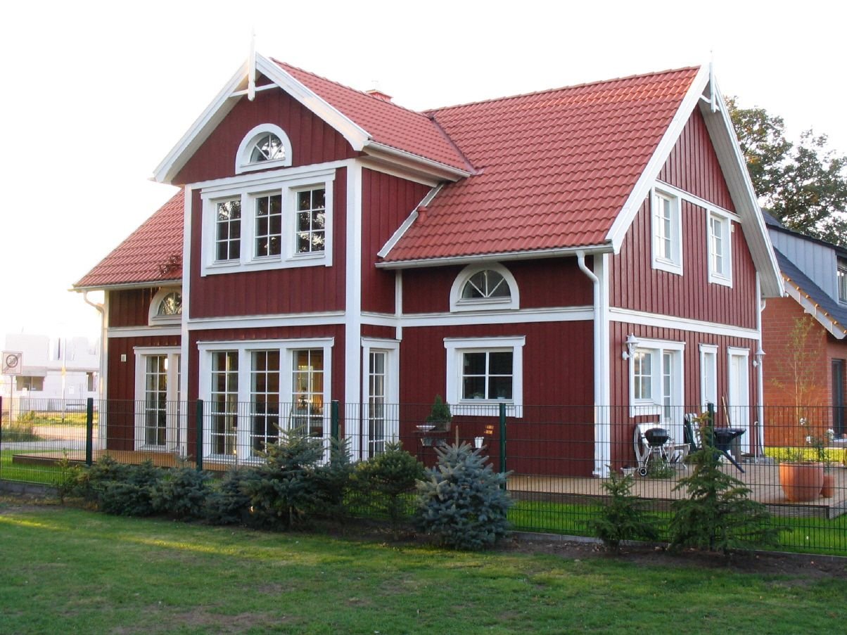 Деревянный дом с красной крышей